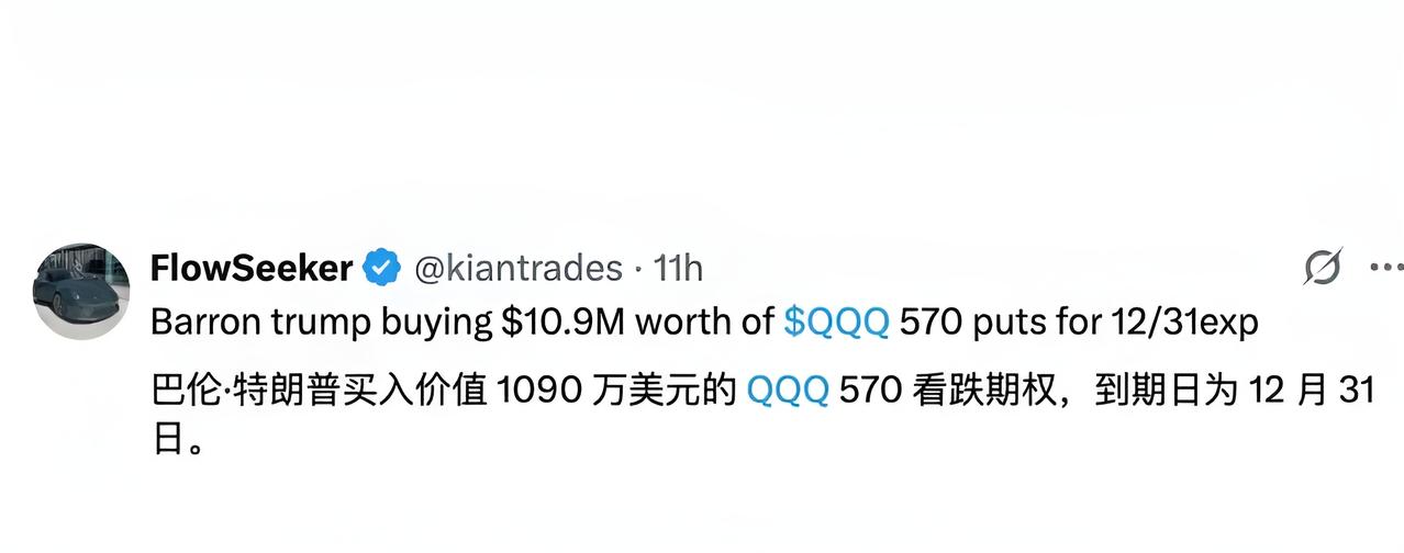 特朗普儿子买入纳指看跌期权,难道是要“做空美国”?! 根据最新市场数据和网络报道,特朗普儿子在2025年10月底买入价值约1090万美元的“纳指100”看跌期权,到期日12月31日,行权价570美元。 这笔纳指100看跌期权的“家族赌注”微妙到让人脊背发凉! 11月6日,目前纳指100收于632.15,隐含约10%的下跌空间——这不只是“对冲”,而是精准押注政府关门引发的流动性危机将压垮科技股泡沫。叠加关门已抽走7000亿美元流动性,回购利率破5.5%、银行储备金缩15%,市场压力直逼临界点,堪比“隐形加息50bp”。 网友直呼“特朗普家族的‘政策预言’”,民主党批“内幕交易升级版”,这波操作的“隐藏意义”远超金钱——它像一面镜子,映出白宫与华尔街的“共生”与乱象。