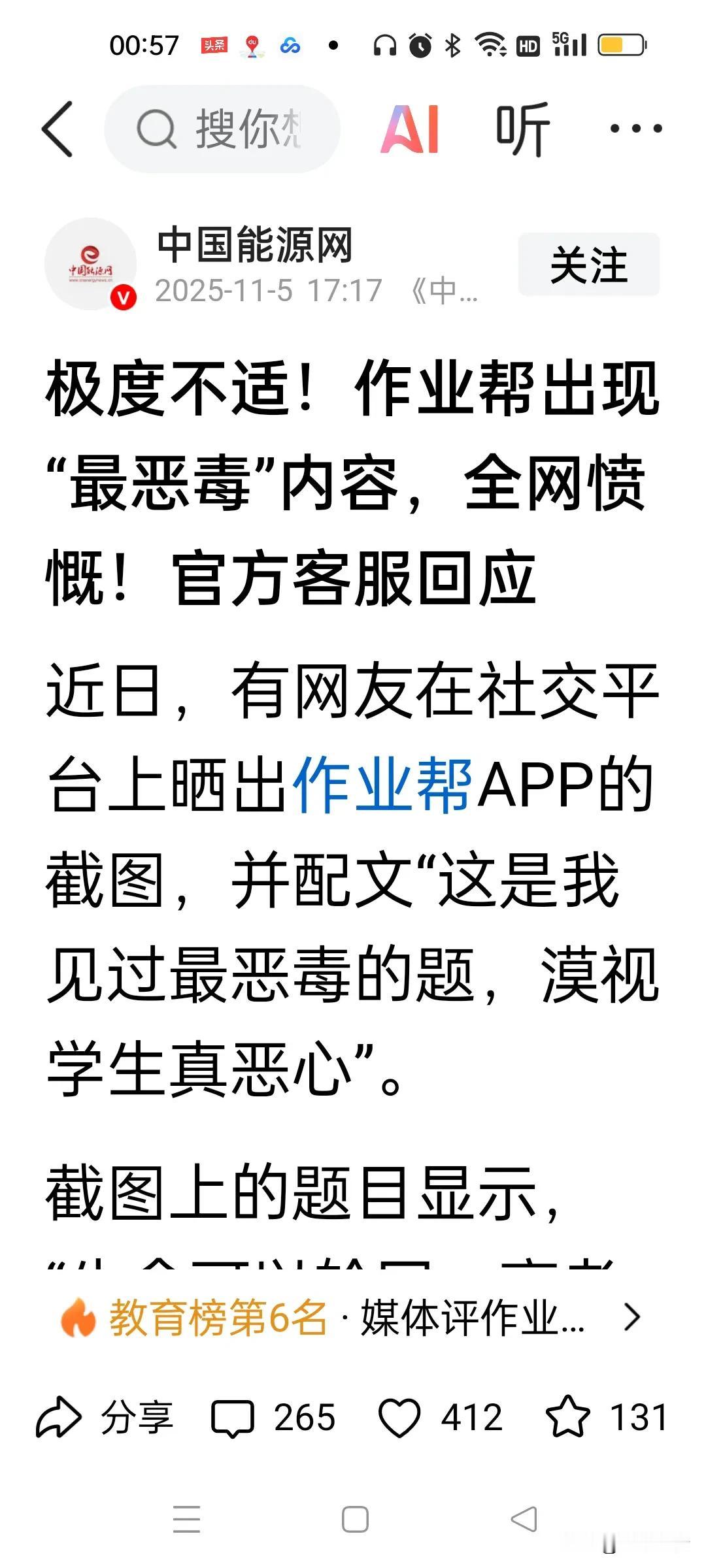 “作业帮”出这样的问题意欲何为? 据媒体报道,作为专门服务学生学习的“作业帮”,竟然出了一道暗含不良导向、引起学生极度不适的问题让学生来解答。难道《作业帮》编写题目就这么随意吗?难道没有人审核把关吗?说轻一点,这是自毁品牌、自断生路,说重一点,这涉嫌违规违法,要追究《作业帮》及相关责任的法律责任。 据《中国能源网》报道,记者向“作业帮”核实情况时,其工作人员表示:该题目此前确实存在,目前已做下架处理。至于该题目具体由谁设计,暂时还不清楚。工作人员还称会马上核实排查,并自查有无类似的题目,进行批量处理。难道仅仅是企业自己下架、排查就完事了吗?有关部门这时候应该出面进行调查处理的。
