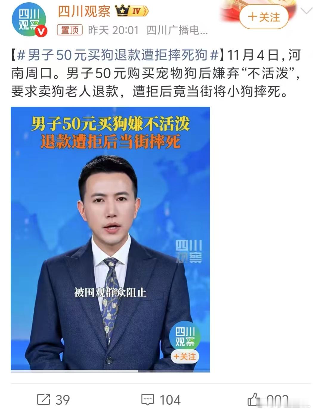 男子50元买狗退款遭拒摔死狗