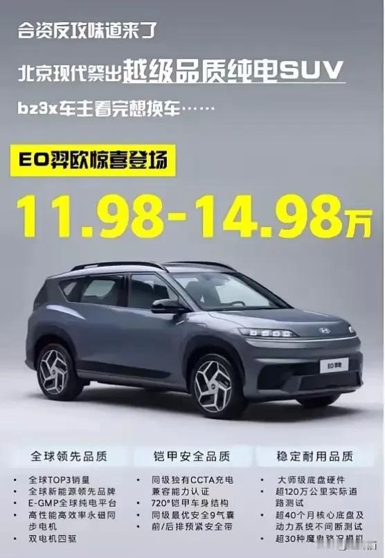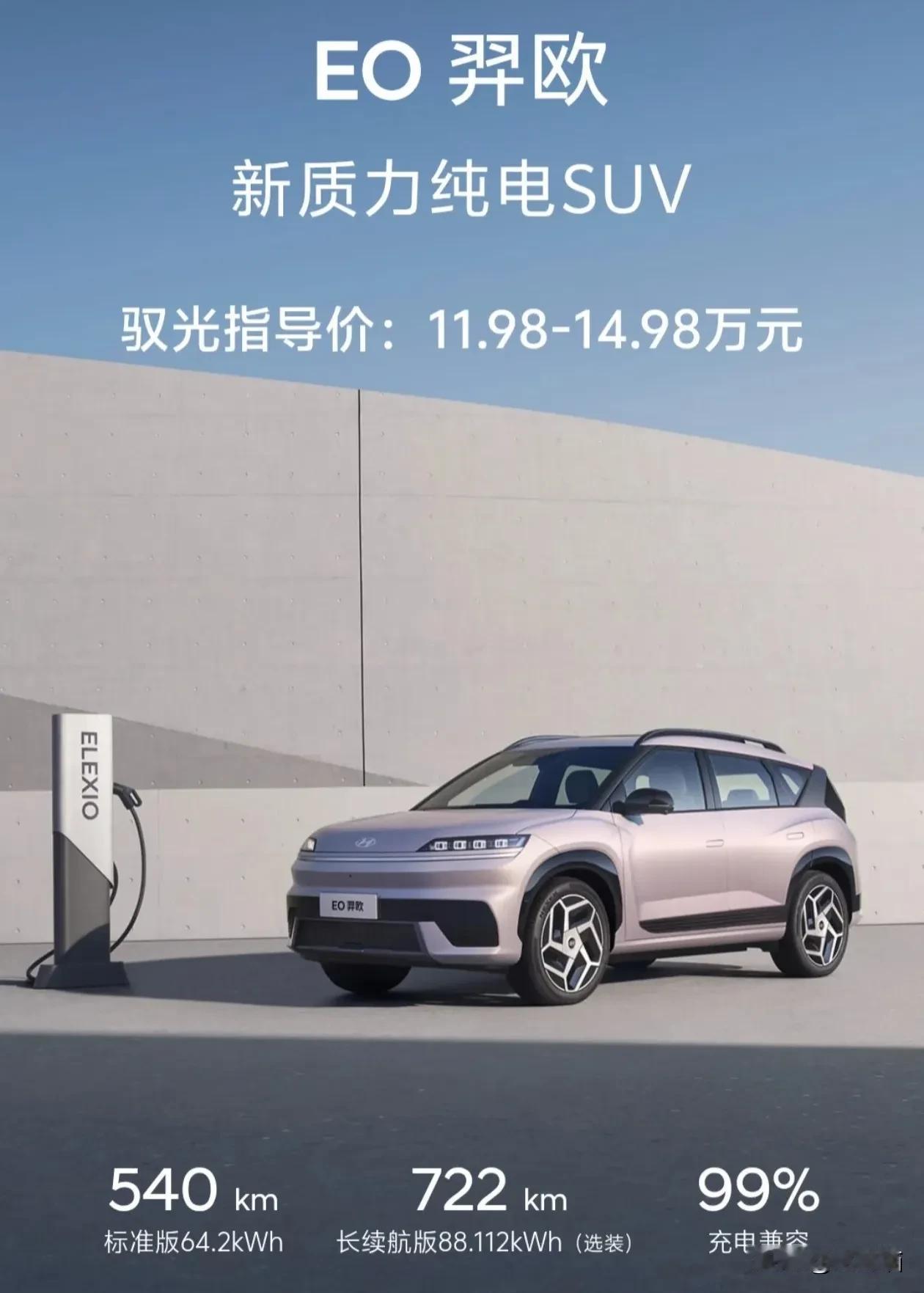 2025年买车参考: 1、三年不换车——买韩系; 2、五年不换车——买美系; 3、八年不换车——买日系; 4、十年不换车——买德系; 5、终身不换车——买国系。 作为北京现代icon旗下首款新质力纯电SUV,EO羿欧以11.98万-14.98万元的售价,凭借“六大品质”核心优势,成为15万内高品质纯电SUV的实力之选,值得入手。 在核心性能上,EO羿欧搭载弗迪icon磷酸铁锂刀片电池icon,CLTC续航直逼722km,彻底打消续航焦虑;同时采用高强度车身结构,能高效吸收、分散撞击能量,再加上出色的操控调校,带来柔顺无感的驾驶体验,让每一次出行都安全又舒心。 智能与体验层面,EO羿欧同样表现亮眼。外观设计时尚大气,全系标配27英寸超薄4K宽幕,搭配高性能的高通icon骁龙8295芯片,无论是视觉观感还是智能交互流畅度,在同级别车型中都极具竞争力。 更值得一提的是,依托北京现代合资大品牌的口碑加持,EO羿欧性价比优势显著,还推出“品质生活好礼”购车优惠——含免费充电桩、0首付购车、4000元置换补贴及无限流量,进一步降低购车门槛,诚意十足。 2025年流传的这个买车参考口诀,其实是有一定道理的。韩系车通常配置丰富、外观时尚,新车价格也较为亲民,但保值率不高,三年后车辆残值往往较低,所以适合只想短时间拥有车辆的消费者 。美系车在前五年能展现出底盘厚重、隔音好、空间大等优点,但五年后变速箱渗油、油耗偏高等问题可能会逐渐显现,维修成本增加,因此五年左右换车较为合适 。日系车以可靠性著称,使用八年仍有较高的残值率,且故障率低于同级平均值,配件价格便宜,维修方便,是追求长期稳定用车消费者的不错选择 。德系车虽然在十年后电气系统等部件容易老化,维修费用较高,但它的底盘质感和驾驶乐趣依然能吸引很多车主,即便维修成本高也愿意继续保留 。而国系新能源汽车发展迅速,OTA升级、三电终身质保等政策,让车辆具有较强的耐久性和可进化性,终身不换车也成为了一种可能 。 在这样的背景下,北京现代EO羿欧的出现,为消费者提供了一个新的选择。这款车在核心性能方面表现出色,搭载弗迪磷酸铁锂刀片电池,CLTC续航直逼722km,解决了消费者的续航焦虑问题 。其高强度车身结构搭配出色的操控调校,让驾驶既安全又舒适 。在智能与体验层面,时尚大气的外观设计,加上全系标配的27英寸超薄4K宽幕和高通骁龙8295芯片,让其在同级别车型中颇具竞争力 。 此外,EO羿欧的性价比也很高。11.98万-14.98万元的售价,加上免费充电桩、0首付购车、4000元置换补贴及无限流量等购车优惠,进一步降低了购车门槛 。而且,作为北京现代旗下的车型,它还拥有合资品牌的口碑加持,质量和售后都有一定的保障。如果你正打算购买一辆15万内的纯电SUV,且对车辆的性能、智能配置和性价比都有较高要求,那么EO羿欧确实是一款值得考虑的车型。