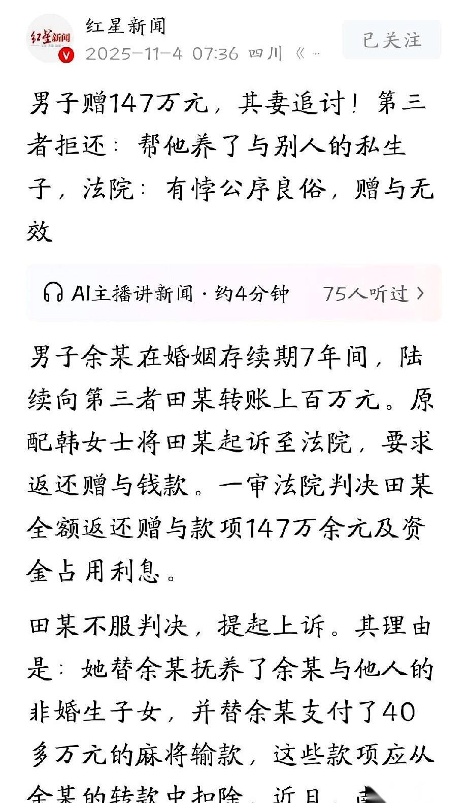 我得缓缓,这剧情给我看懵了。 所以说,你跟一个有妇之夫以夫妻名义同居7年,花了人家老婆辛辛苦苦攒下的140多万,买了房买了车。 东窗事发后,原配找上门,你反手一个“我才是受害者”? 理由是啥? ——“我是在替他养他跟别的女人生的孩子。” ——“我还替他还了40多万的麻将债。” 姐们儿,你这是在挑战我的认知吗? 你当自己是普度众生的活菩萨,还是感动中国的道德模范啊? 这男的也是个极品,家里一个老婆省吃俭用,他在外面又养一个“家”,还顺带解决了另一个“家”的抚养问题。时间管理大师,资产配置鬼才。 最心疼的是原配。 被蒙在鼓里7年,自己的血汗钱,被小三拿去挥霍,还反过来被短信辱骂。 这口气,换谁能咽得下去? 还好,法律没陪他们演戏。 法院的判决下来,真是大快人心:赠与无效,全额返还,还得算利息。 有些人就是这样,干着最没底线的事,却总能编出最离谱的理由,把自己包装成全世界最无辜的人。 可惜啊,剧本写得再好,生活不是偶像剧,法律更不是。 账,终究是要算的。