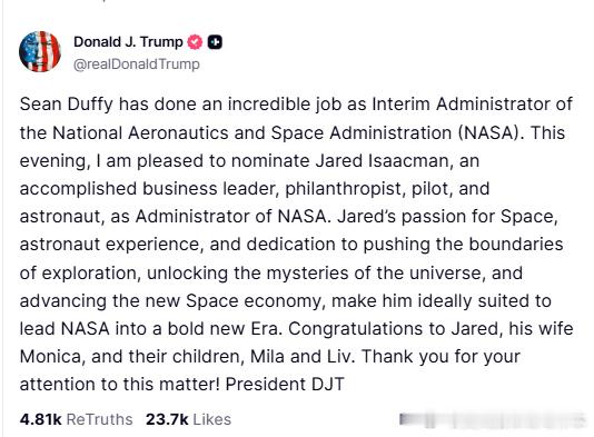 【黄金时代】川普再次提名马斯克好友贾里德·艾萨克曼担任NASA局长