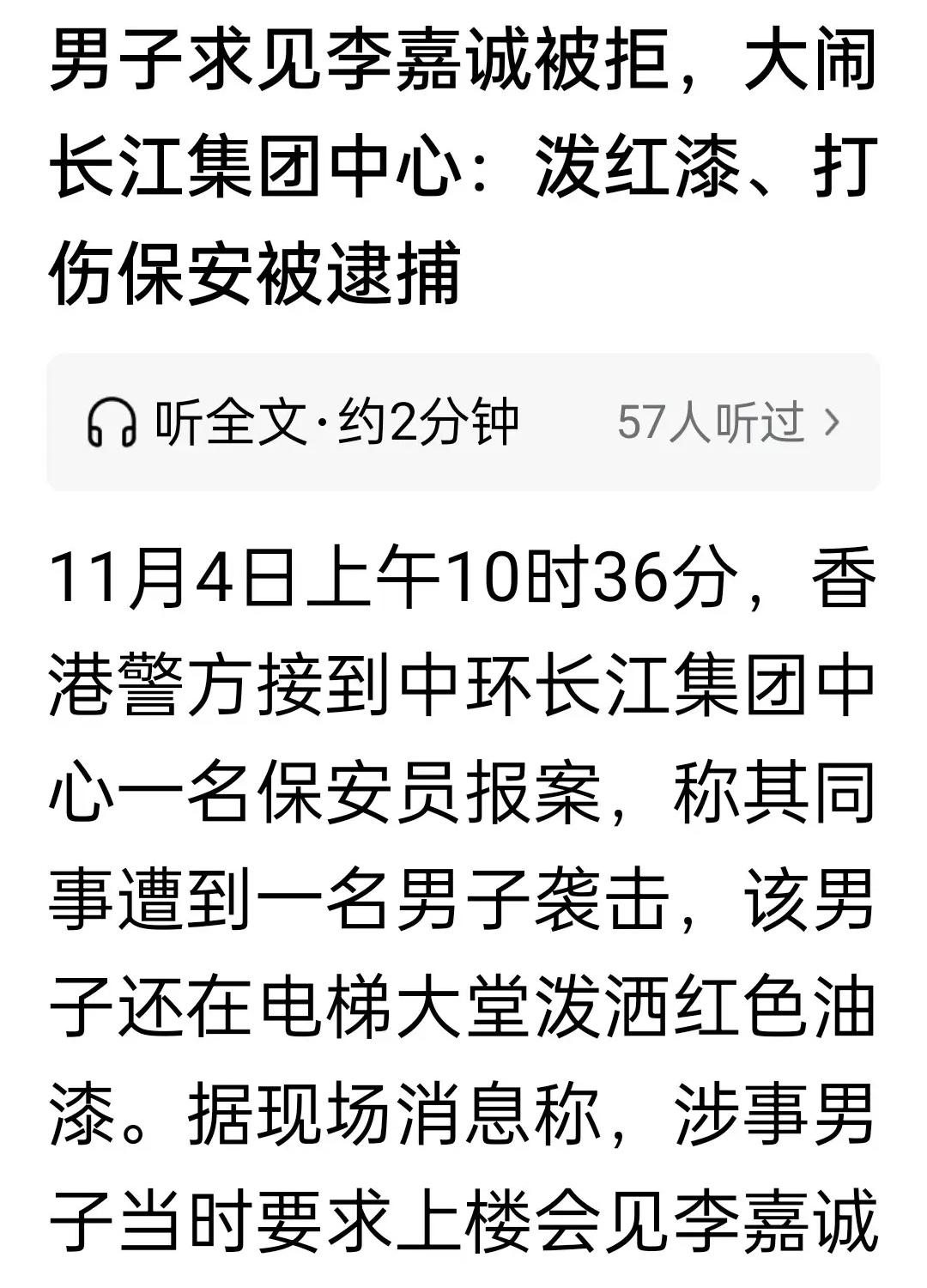 这两天李嘉诚心里应该不是滋味,全运会火炬在粤港澳大湾区传递,香港四大家族去了三家,澳门何家也参加了,唯独李嘉诚两个儿子没有参加,为什么不参加这么重要的活动,大家也都心知肚明了。 另外,昨天一位男子大闹香港长江集团中心,还对着大厦泼红油漆,该男子要见李嘉诚,还打伤保安,最后被逮捕。不知道这位男子是不是买了李嘉诚家族盖的房子还是其他原因感到不满从而做出如此过激行为。 不难看出,李嘉诚家族在经历了卖港口事件后,其在香港的公众形象与社会关系正经历着前所未有的微妙变化。 网友纷纷表示: 企业家要有企业家的家国情怀,这一点香港霍家就做得非常好,是香港企业家的典范。 李嘉诚虽有商业建树,但他长期将资产外移。2025年,其旗下企业更拟将巴拿马运河核心港口等战略资产售予美资。此举被指罔顾国家利益、给外部势力“递刀子”,最终遭遇监管反制。 全香港的人,全澳门的人都去了,李嘉诚不去也很正常,不管邀请与否。世界上的事不管是什么,并不是你觉得重要,意义大,所有的人都必须和你的看法一致。