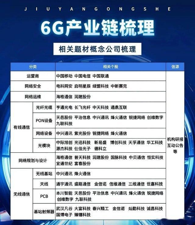 6G产业链覆盖运营、安全、有线/无线通信等多环节,当前处于技术研发与标准化阶段,这些个股分布在各核心环节,是产业链的核心参与者。后续随着6G技术成熟、商用进程推进,各环节的设备、技术服务需求将逐步释放,但需注意6G商用仍需较长周期,短期以技术研发与产业链储备为主,长期需关注技术突破、标准落地及商用节奏。