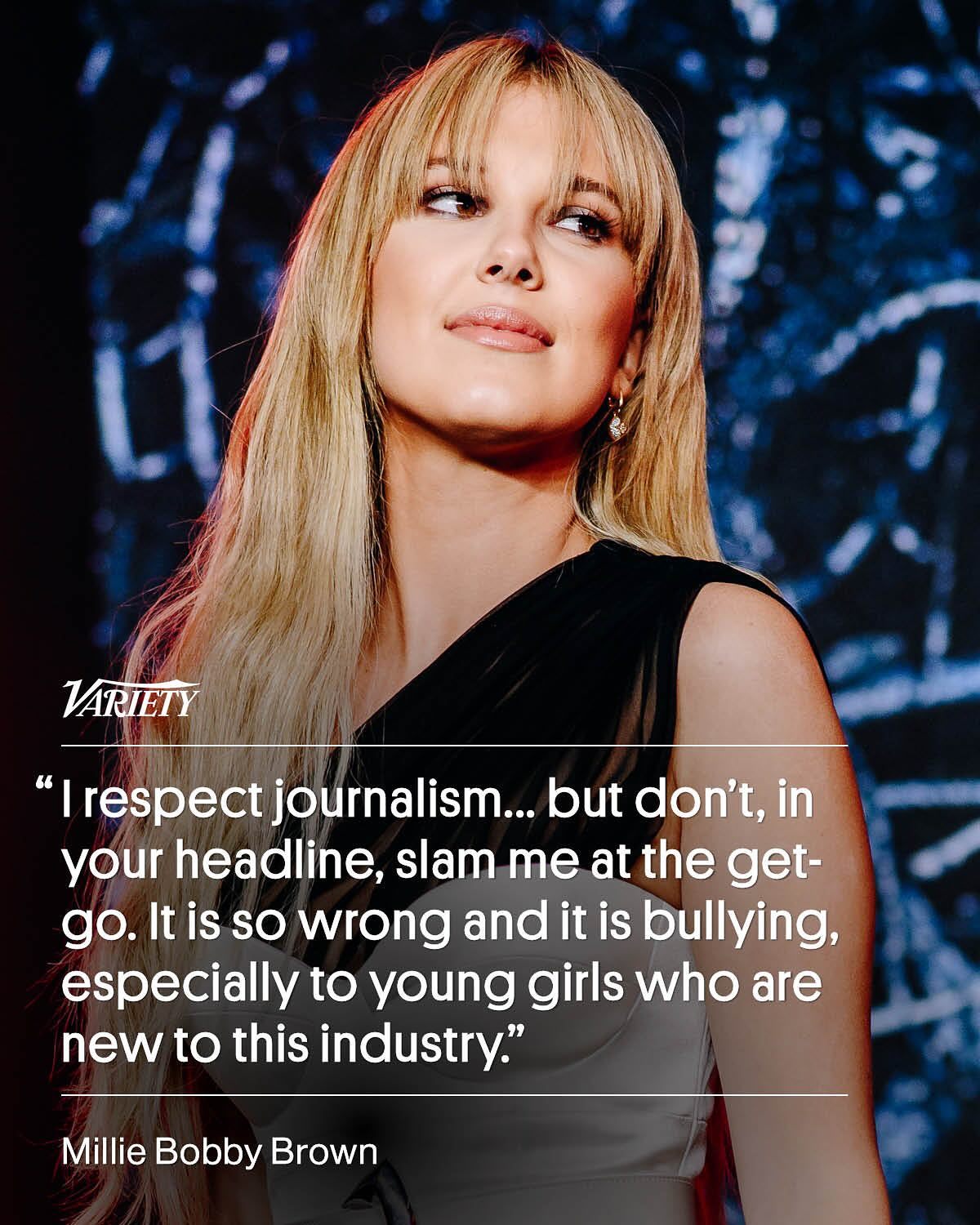 米莉·波比·布朗最新在英国版《Vogue》专访中说:“我尊重新闻行业。我喜欢阅读关于我偶像的报道,想知道他们的近况。我理解狗仔队的存在,即便这种文化充满侵扰性,即便让我感觉糟糕透顶——我知道这是你们的工作……但别在标题里一开始就抨击我。这大错特错,根本就是霸凌,特别是对那些刚入行,对周遭一切充满疑虑的年轻女孩们。”