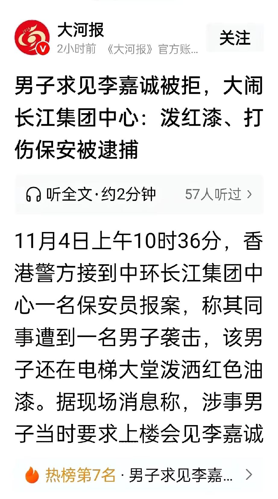 李嘉诚缺席全运会火炬传递、长江中心突遭泼漆——两件事撞在一起,是巧合,还是“李超人”在香港的声望正在急转直下? 火炬传递当天,香港四大家族里三家都到场,澳门何家也亮相,唯独李家缺席。紧接着,一名男子冲到长江中心泼红漆,大喊要见李嘉诚,还打伤保安。虽然动机未明,但社交平台已把两事捆绑解读:港口风波后,李家在港人心中的“安全垫”正被一层层撕掉。 有网友说“爱国是评判成功人士的硬标准,任何国家无一例外。”还有网友拿霍家对比:“企业家要有政治敏感性,没有家国情怀终究走不远。” 当商业理性撞上国家战略,李嘉诚这次“卖港口”究竟是精明的资本腾挪,还是一次误判时代情绪的高风险操作?评论区聊聊,你觉得企业家在“利”与“义”之间该怎么选?