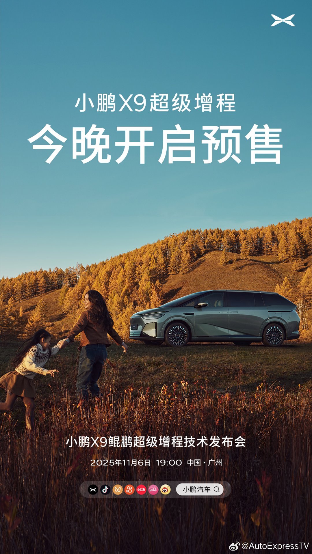 今晚,小鹏X9鲲鹏超级增程技术发布会即将开启,同步启动预售!