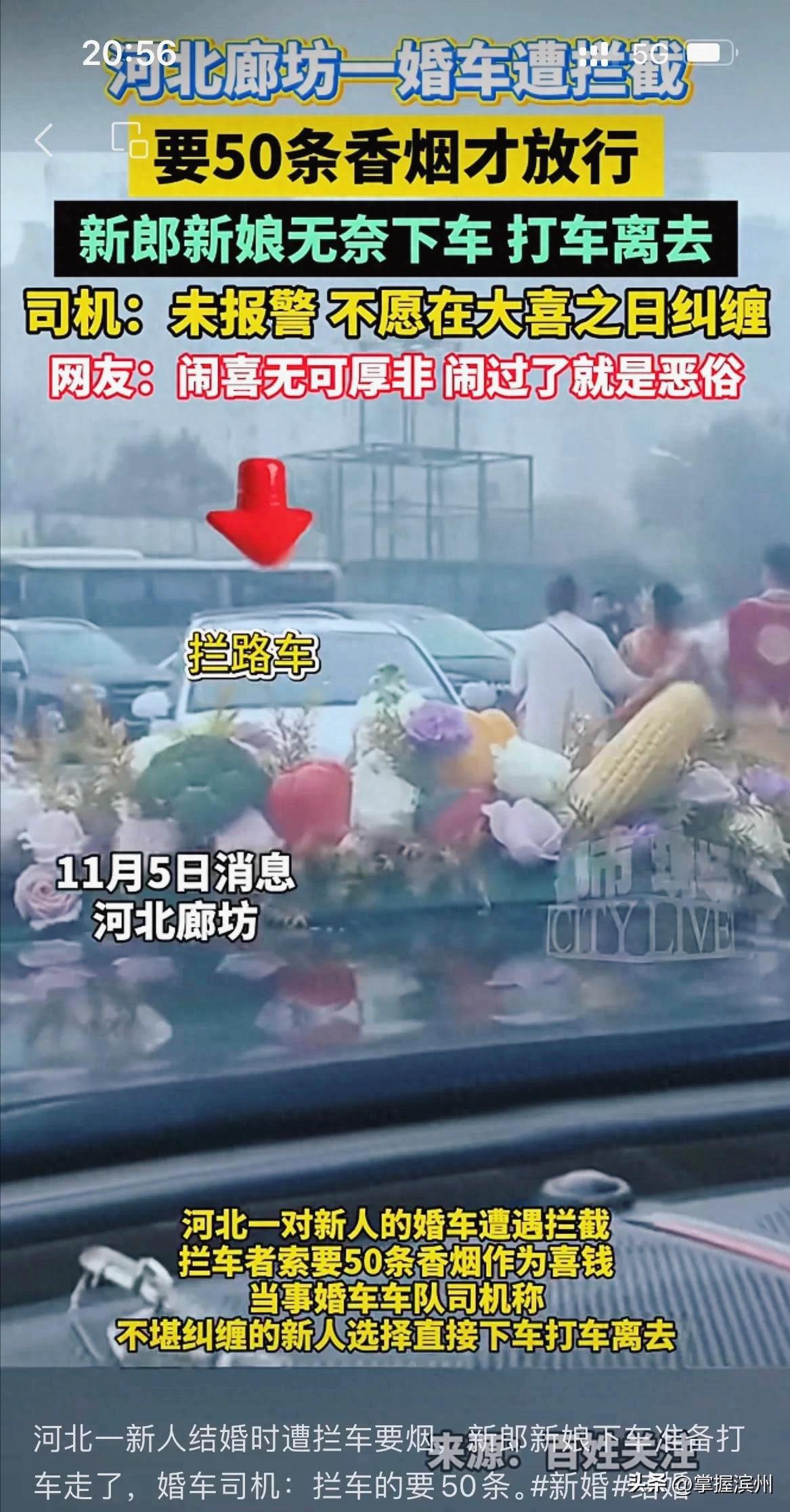 这大喜的日子,怎么就能碰上这么堵心的事! 就在11月5号,河北一对新人结婚,婚车竟然被人给拦下了。这拦车的人可不是为了道喜,张口就要50条普通香烟,或者10条高档烟当“喜钱”,不给就不让走。 这哪是讨喜,这不成了拦路抢劫了吗?双方僵持了将近一个小时,新人为了不耽误吉时,不想在大好日子里纠缠,最后是又生气又无奈,只能弃了婚车,打车离开。 据婚车司机说,因为被拦的位置在酒店停车场,当时并没有报警。可是,这么离谱的要求,已经远远超出了传统“讨喜”的范畴,完全变了味。 以前拦婚车,要点喜糖、几盒烟,是图个喜庆,大家哈哈一笑也就过去了。但现在这样明码标价、强索财物的行为,不仅不文明,更可能已经涉嫌违法。 结婚是人生大事,这样的婚闹陋习,真该停停了!您觉得呢?