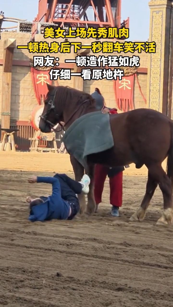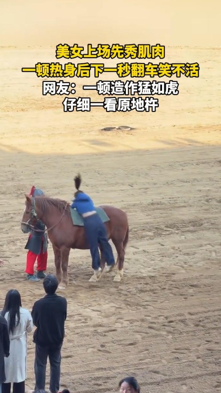 近日河南开封,一30岁女子来到马场准备骑马比赛,热身时直接脱去外套,秀了一番肌肉,没想到,下一秒就笑不活了! 女子秀完肌肉,准备上马,谁料,一个没注意竟然上马失败,从马背上摔了下来,直接摔了个四脚朝天,引得周围观众哈哈大笑!开赛前还特意脱去衣服,向观众展示自己的肌肉多结实,谁料,竟然连马都上不去,真是一顿操作猛如虎,仔细一看原地杵!