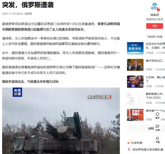 轰炸继续,俄罗斯港口已经基本失去了防空能力。本月3日,乌克兰又对俄罗斯能源设施出手了,上次炸的是莫斯科。这次直接瞄准了俄罗斯的能源命门——俄罗斯最大的石油港口图阿普谢港以及运输石油的货轮。 实际袭击是11月2日深夜发生的,几十架无人机贴着海面就窜进了图阿普谢港区,雷达屏幕直接闪成了雪花片,连敌人从哪儿来、到底有多少都看不清楚,这防空系统跟个摆设也没啥区别了。 无人机残骸砸中油轮甲板的瞬间,火舌顺着缝隙就往船舱里钻,输油终端的储油管道也被炸裂了口,黑色的油浆混着消防水在地上流得到处都是,连郊外居民楼的玻璃都被冲击波震得粉碎。 戏剧性的是,俄军方事后通报压根没提雷达失效这事儿,就含糊说“击落了部分无人机”,可港口烧得通红的大火、被砸坏的设施,早把真相扒得明明白白。 这已经不是图阿普谢港第一次遭殃了。早在9月25日,乌克兰就用一模一样的法子袭击过这里,还有新罗西斯克港,直接让两座港口一天合计200万桶的原油出口能力停了摆。 这俩港口承担着俄罗斯近五分之一的黑海原油出口量,每停一天,就意味着一天少赚上亿美元。 当时俄军还拍着胸脯说要加强防空部署,结果不到两个月,同样的戏码又演了一遍,之前说的“强化防御”,看着更像给自己找台阶的空话。 乌军能一次次得手,说白了就是摸透了俄军防空的软肋。这次用来袭击的无人机,多半是改装过的FPV款,单架成本也就500到1200美元,连军用直升机一个零件的钱都不到。 它们专门贴着50米高的海面飞,刚好卡在雷达处理杂波时的盲区里,像S-400那种主打中高空防御的系统,根本抓不着它们。 更狠的是乌军的打法,先派几架无人机带着干扰设备,把火控雷达弄瘫痪了,后面的无人机再跟着冲进去,整套流程下来,跟给防空系统开了后门似的。 面对这种打法,俄罗斯的防空系统明显跟不上趟。部署在港口的“铠甲-S”近防系统,号称每分钟能拦10个目标,可真遇上无人机蜂群攻击,漏洞就全露出来了。 有军事博主算过一笔账,一枚拦截导弹至少要20万美元,用来打几千美元的无人机,打十回就亏得比无人机本身贵十倍不止,这种赔本买卖根本没法长期干。 上次3月的时候,乌克兰一次派了337架无人机来袭击,俄军说击落了大半,可还是有不少钻了空子,现在几十架的规模,更是轻松就能突破防线。 图阿普谢港的地位特殊,这次袭击的影响也跟着放大了好几倍。这里不光有俄罗斯石油公司的核心炼油厂,还是里海原油运到外面的关键枢纽,输油管道直接连着重内陆的油田。 9月那次袭击后,俄石油花了三周才恢复一部分运力,这次储油设施和油轮一起受损,修复时间肯定更长。 更麻烦的是,乌军还在把这种战术用到更多目标上,6月那次“蛛网行动”,他们用一百多架无人机突袭俄罗斯的轰炸机基地,把单价2亿美元的图-95炸得只剩残骸,可整个无人机集群的成本才10万美元,简直是用小钱办大事。 俄军不是没意识到问题,只是想解决也没那么容易。他们试过加派电子战部队,可乌军的无人机改成用民用通信频段了,干扰效果差得要命;想部署更先进的S-500系统,又舍不得一套3.5亿美元的造价——毕竟港口不止一个,要是全换成S-500,根本负担不起。 有消息说军方内部还在吵,是接着买高价防空导弹,还是换成8万美元一枚的光纤制导导弹,可吵来吵去,无人机该突破防线还是照样突破。 乌克兰的目标很清楚,就是用低成本打击拖垮俄罗斯的能源经济。图阿普谢港的原油出口直接关系到俄罗斯的财政收入,每袭击一次,运输成本就涨一次,逼得航运公司要么多花钱买保险,要么绕更远的航线。 从莫斯科的行政大楼到黑海的石油港口,乌军打击的范围越来越广,可俄军的防空系统始终没拿出管用的办法,下次被盯上的,说不定就是更核心的能源枢纽。 这种不按常理来的消耗打法,正在慢慢磨掉俄罗斯战略上的底气,毕竟家底再厚,也经不住这么没完没了地折腾和损失啊。