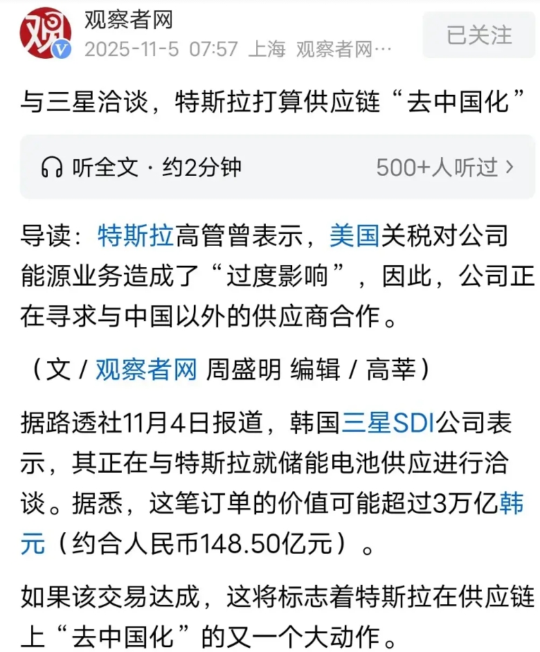 特斯拉打算供应链”去中国化”吗?特斯拉跟三星在谈判,特斯拉计划要买三星的电池,目前特斯拉的储能电池100%来自宁德时代,如果特斯拉和三星的订单谈成,意味着特斯拉在供应链“去中国化”迈出了一步!马斯克不要忘了是谁在关键的时刻帮你起来的,如果没有当时上海伸出的橄榄枝,估计都没有今天的特斯拉和马斯克,如果特斯拉在供应链上搞“去中国化”,那我们是不是可以在中国市场搞“去特斯拉化”!