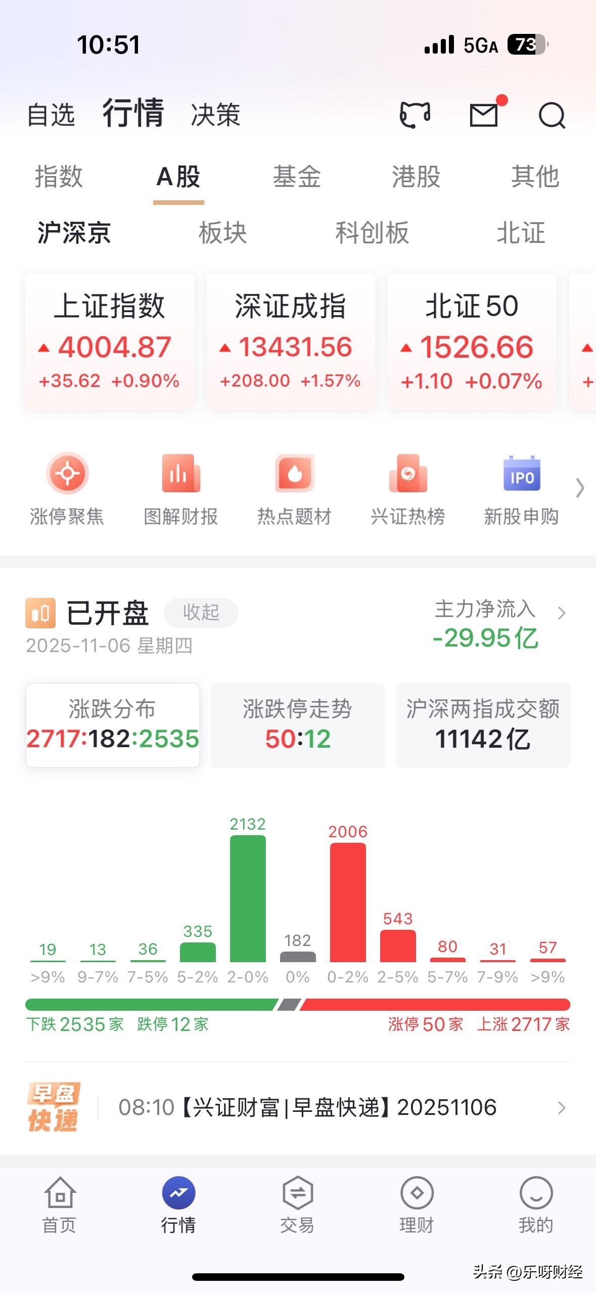 A股重返4000点,涨跌比持平,究竟谁在狂欢?我们心心念念的券商板块涨近1.8%,应该是主要贡献力量之一,半导体板块重新归来,大涨超4%。 可惜的是,A股赚钱效应仍不明显,4000点之上的A股仍是结构行情,普涨仍还在路上。 高企的居民储蓄大搬家,以A股目前的走势来看,仍然不太现实,主要就是赚钱效应不明显。 眼下正是机构主导的行情格局。 当然如果小白刚入市都能很明显地赚到钱,那A股市场的行情演绎也不容易走远! 乐呀财经