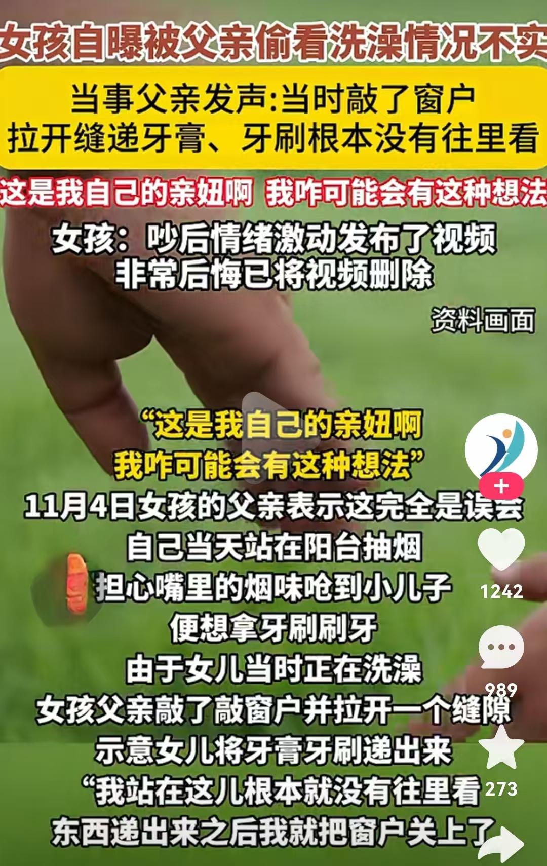 河南郑州女孩网络发视频自曝亲生父亲偷看自己洗澡这件事,表面看是女孩在寻求网络支持,实际上是更大的可能是女孩被网络洗脑的结果。 虽然事情证实女孩造谣,父亲偷看自己洗澡的事情被澄清,但是舆论依然在发酵,很多人为这个问题在争论,有人支持女孩,更多人却是客观看待问题的。 在我看来,现在网络上越来越多的孩子受到不明势力蛊惑,他们仇恨原生家庭,恨自己的父母,认为自己的父母没有给提供优厚的生活条件,没有满足自己虚无缥缈的要求,就怪自己父母无能,再加上这种长此以往的暗示,孩子就对父母心生恨意,编造各种谣言也就可以理解了。 这个最根本的原因,还是一些平台宣扬“男女对立”“没有钱别生孩子”的毒观念的结果。我在这里请求大家,无论在哪里遇到这种论调的东西都要点个举报,净化网络坏境,人人有责,有利于每一个有良知的正常人。