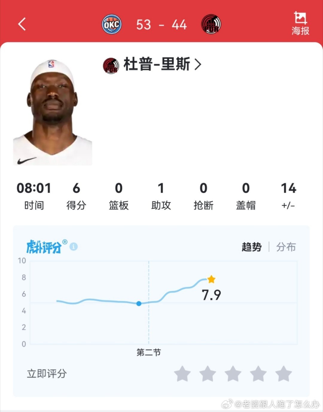 开拓者vs雷霆里斯又把握住了机会,今天比罗威打的还好,上场就有效果