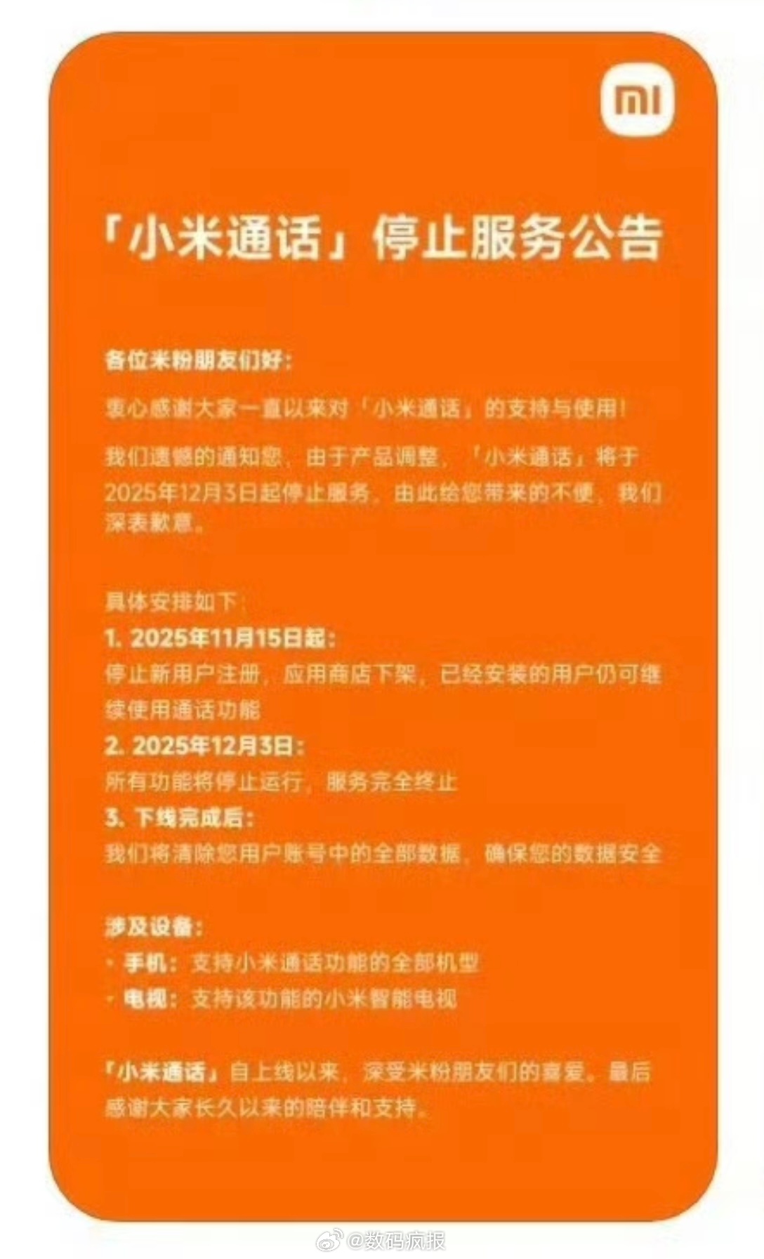 小米通话将停服原来是许多年前开发的一个app,功能类似是微信打电话,不是小米手机不能打电话了!想当年免费打电话的app不少,后来都用微信了,如果米聊运气好点做成了,早就没有微信啥事了[允悲]