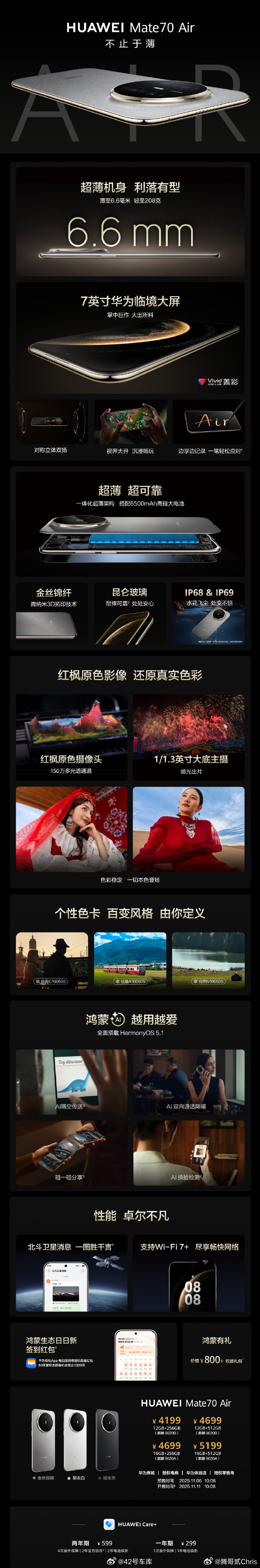 华为Mate 70 Air,4199起的纯血鸿蒙,心动!我都想给我妈换一台,老人家只要求轻薄+拍照好看