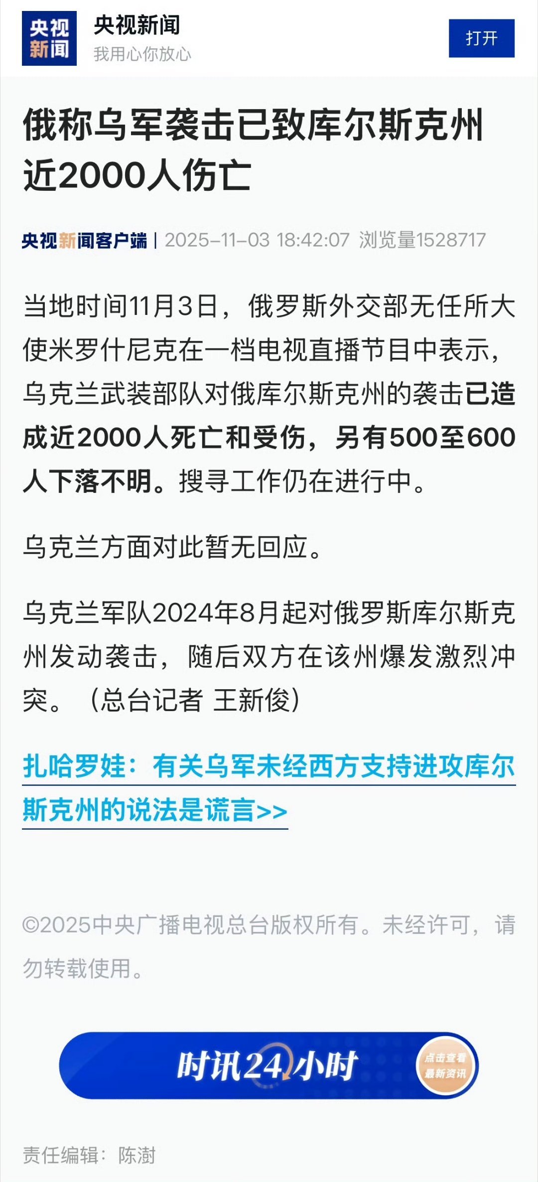 来自俄罗斯的假消息【俄称乌军袭击致库尔斯克州近2000人伤亡】俄罗斯外交部无任所大使米罗什尼克当地时间11月3日在一档电视直播节目中发布的这个消息,至今未见克里姆林宫发言人佩斯科夫、俄外交部发言人扎哈罗娃提及,也未见乌克兰方面发布的相关消息。基本上可以肯定,这又是一则“假消息”。看图说话