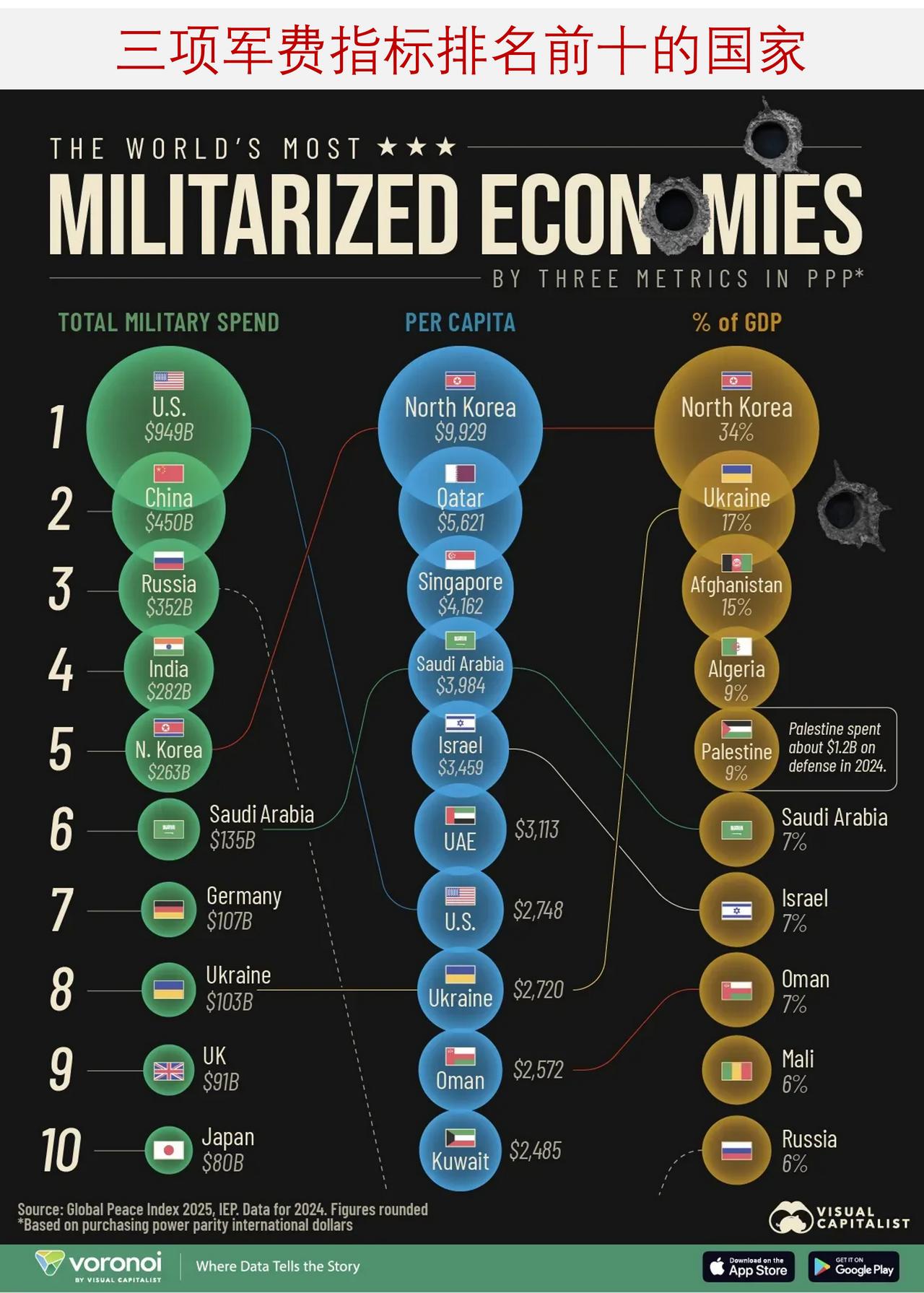 按军费总额、人均军费和军费占GDP比例分别排名全球前十的国家是哪些? 在 2024 年,美国、中国和俄罗斯是军事开支最高的三个国家,它们的开支总额占全球总开支的五分之二以上。 总体而言,全球军事开支达到了创纪录的 2.7 万亿美元,较上年增长了 9.4%。在地缘政治紧张局势加剧的情况下,全球五大地区的军事开支均连续第二年有所增加。 下面这张图表基于经济与和平研究所的数据,从三个维度展示了全球军费排名前十的国家。 ——2024 年军费总额最高的十个国家 下面图表列出了 2024 年军费预算最高的国家。数据以购买力平价(PPP)单位来表示。 美国的预算总额达 9490 亿美元,其在全球范围内共有 4790 个军事基地,约有 150 万名现役军人。 接下来是中国,其军费预算规模达 4500 亿美元。 排名第三的是俄罗斯,由于乌克兰持续的冲突,该国在 2024 年的军费支出增加了约 38%。 ——人均军费最高的十个国家 就人均军费而言,朝鲜遥遥领先,处于首位。 卡塔尔是一个与沙特阿拉伯接壤的海湾小国,其排名第二,这是由于其军事、海军和空军的全面现代化进程。 有趣的是,从这一指标来看,新加坡排名第三,尽管它一直被视为一个中立国家。实际上,新加坡几十年来一直将国内生产总值的约 3%用于国防开支,这一比例高于大多数欧洲国家。 ——军费占国内生产总值比例最高的前十国家 朝鲜在军费开支占国内生产总值的比例方面在全球处于领先地位,其这一比例在 2024 年达到了 34%。 位居第二的是乌克兰,其占国内生产总值的比例为 17%,总计达 1030 亿美元。 相比之下,俄罗斯的军费开支占国内生产总值的 6%,在 2024 年将达到 3520 亿美元。如今,俄罗斯拥有欧洲规模最大的军队,现役人员达 130 万,而乌克兰紧随其后,现役军人有 90 万。
