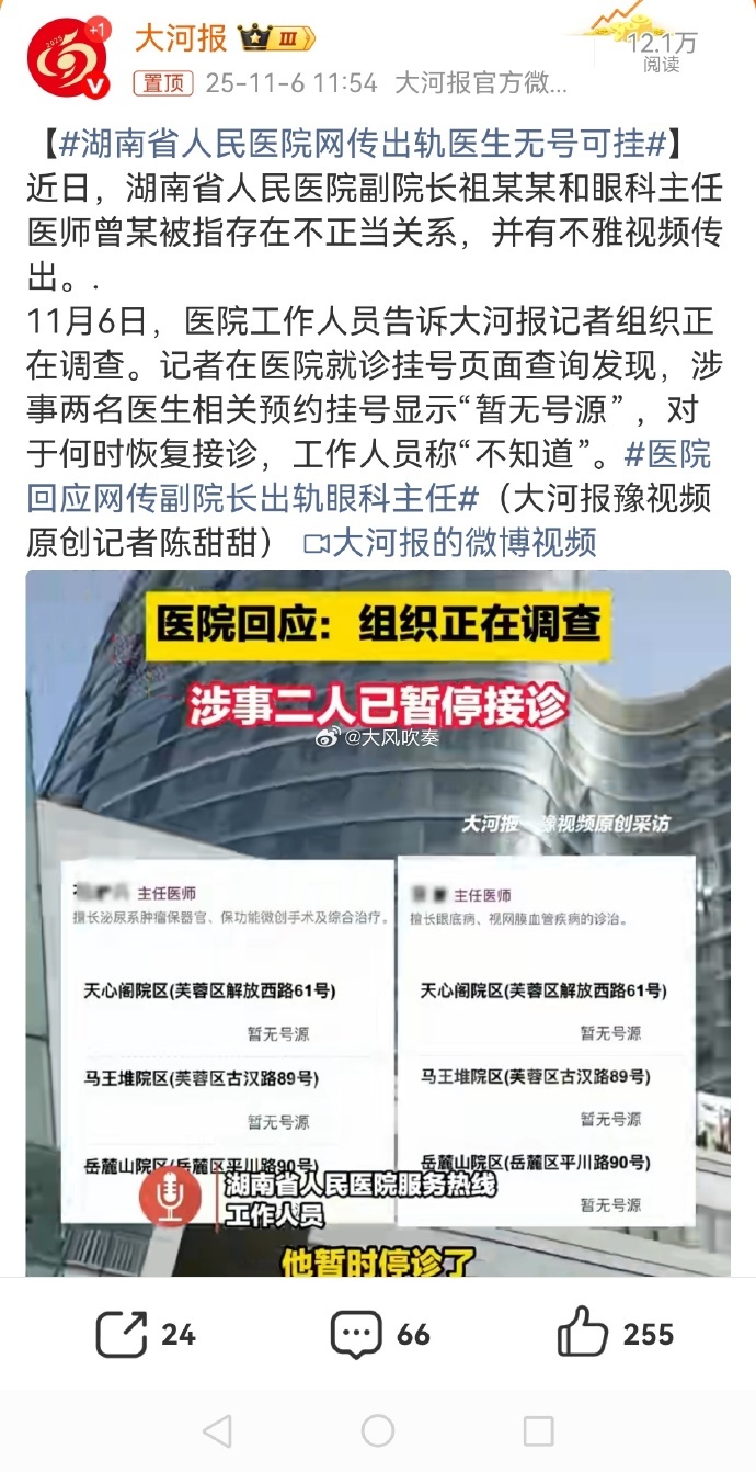 医院回应网传副院长出轨眼科主任【湖南省人民医院网传出轨医生无号可挂】湖南省人民医院副院长祖某某与眼科主任医师曾某因不雅视频传出被指存在不正当关系,医院表示正在调查。目前两位医生在挂号系统中"暂无号源",接诊安排未定。