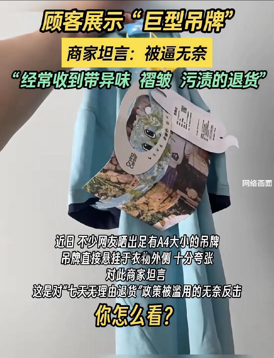 有种强烈预感! 巨型吊牌的事情这样一搞! 电商行业要变天了,不是因为店铺老板不行而是因为白嫖党太让人气愤了! 七天无理由退货本是福利,却成了部分人的“免费租衣券”——穿去约会拍照、参加派对,沾着粉底液和汗渍就退回,商家不仅要亏运费清洗费,衣服直接报废没法二次卖。更气人的是,这些“二手新衣”最后会落到无辜买家手里,花正价买脏衣服的委屈谁懂? 巨型吊牌才几毛钱成本,却能精准拦住“穿后退货”,既不影响正常试穿,还能护着诚信买家的权益,这波操作真的该点赞。其实行业变天的核心从不是手段,而是得守住“诚信”底线,规则是用来保护双方的,不是让自私者钻空子。 你有没有买到过疑似被穿过的网购衣服?支持商家用巨型吊牌这类防护手段吗?