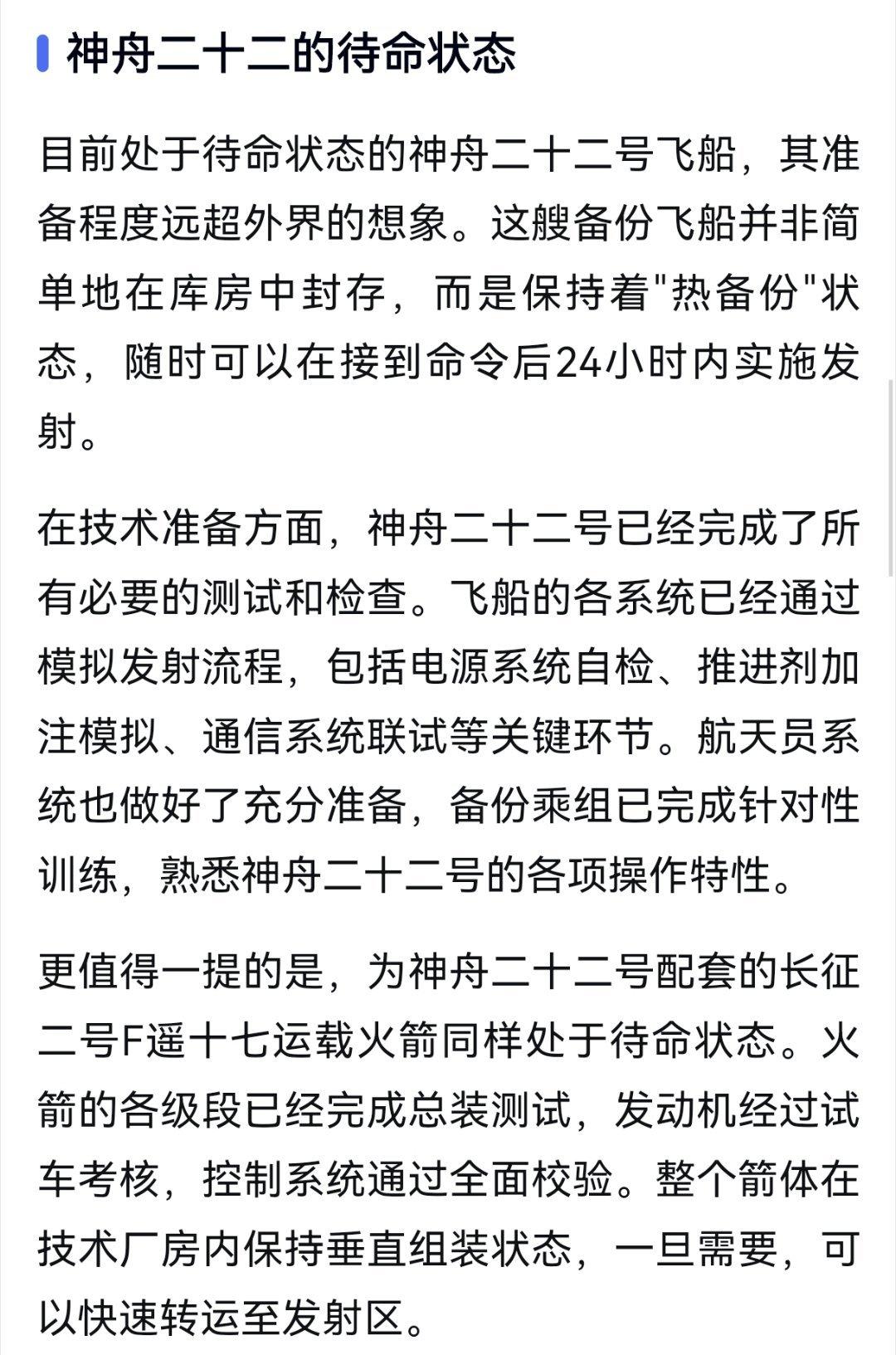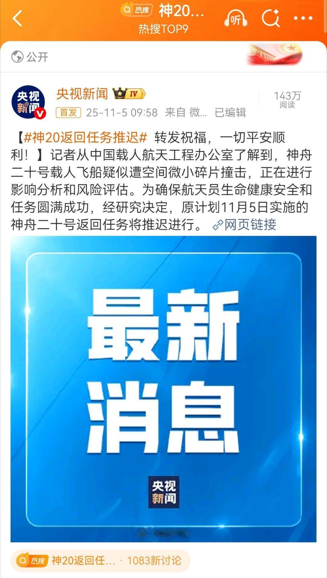 接下来全世界将看到中国是如何救援空间站宇航员的!俄罗斯、美国轮番表演了一番太空救援,俄罗斯联盟号飞船遭遇碎片撞击,救援飞船2个多月后才抵达,美国波音飞船抵达空间站后故障无法返回,救援飞船将近9个月后才将宇航员带回地球,被波音飞船带上去的那俩宇航员都瘦脱相了,看了着实有些可怕! 神舟二十号原定于11月5日的返回计划临时推迟,这一消息一出,外界很快注意到了背后的原因:官方透露飞船“疑似遭遇空间微小碎片撞击”。 这个消息一度让人紧张,但整个事件并没有引起恐慌,相反,它更是一次实战演练,清楚地展示了中国载人航天在面对突发状况时的应急体系,以及通过系统化手段保障航天员安全的能力。 要知道,太空环境比地面复杂得多,存在大量不可预测的危险,全球轨道上大约有1.4亿个毫米级别的碎片,它们飞行速度极快,每秒可达7到10公里。 别看这些碎片很小,一个仅1克重的小东西,如果撞上航天器,其释放的能量就相当于一辆高速行驶的汽车,足以损坏关键设备,甚至造成舱体失压,严重威胁航天员的生命安全。 中国航天在设计和任务规划时,就把这些风险考虑在内,神舟飞船本身装备了高强度缓冲材料和防护装置,这是面对碎片撞击的第一道防线。 同时,中国建立了完整的监测和预警系统,可以实时追踪潜在威胁,并提供规避方案,从源头就在尽可能地减少事故发生的可能性。 更重要的是,中国航天拥有独特的“双保险”机制,也叫“发一备一”,神舟二十一号飞船已经对接在空间站上,它可以在紧急情况下,立即为航天员提供安全避难的在轨备份方案。 同时,地面上的神舟二十二号飞船和对应的运载火箭,已经完成了全部系统检查和发射前测试,整套设备处于随时可以启动的状态,控制中心全天候监控,确保在任何突发情况下都能立即发射,形成了完整的应急准备体系。 也就是说,无论遇到什么突发情况,中国都能在最短时间内从轨道或者地面展开救援,形成时间和空间上的双重保障。 这种安排的优势在国际上非常明显,俄罗斯的联盟号MS-22飞船,在22年因被撞击,冷却剂泄漏事故,航天员不得不在没有在轨备用飞船的情况下,等待很久才迎来救援。 美国商业航天的波音“星际客机”在2024年6月5日发射后,也因多项设备泄漏问题,航天员的返回计划被迫延迟至2025年3月,下来后宇航员都瘦到脱像,变得“人不人鬼不鬼”的样子。 而问题的根源很大程度上,在于商业航天模式下涉及多家企业和复杂流程,救援效率受限。 相比之下,中国航天的优势来源于统一指挥和高度协同,遇到突发状况,国家可以快速调动所有资源,指挥链条短、决策高效,每个部门分工明确、行动迅速,没有企业间的协调和利益冲突问题。 所有力量集中于一件事:保障航天员安全,这种制度带来的确定性,是任何复杂太空任务中最可靠的底气。 信源:央视新闻
