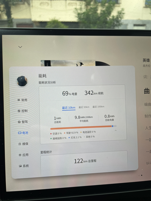 MONA 03续航好虚啊 图一是上次充满电后的行程和电耗,开了330km剩余10%,满打满算也没有400km。 图二是不开空调白天开出来的最低电耗。 还有,车辆静置掉电挺明显的,肉疼
