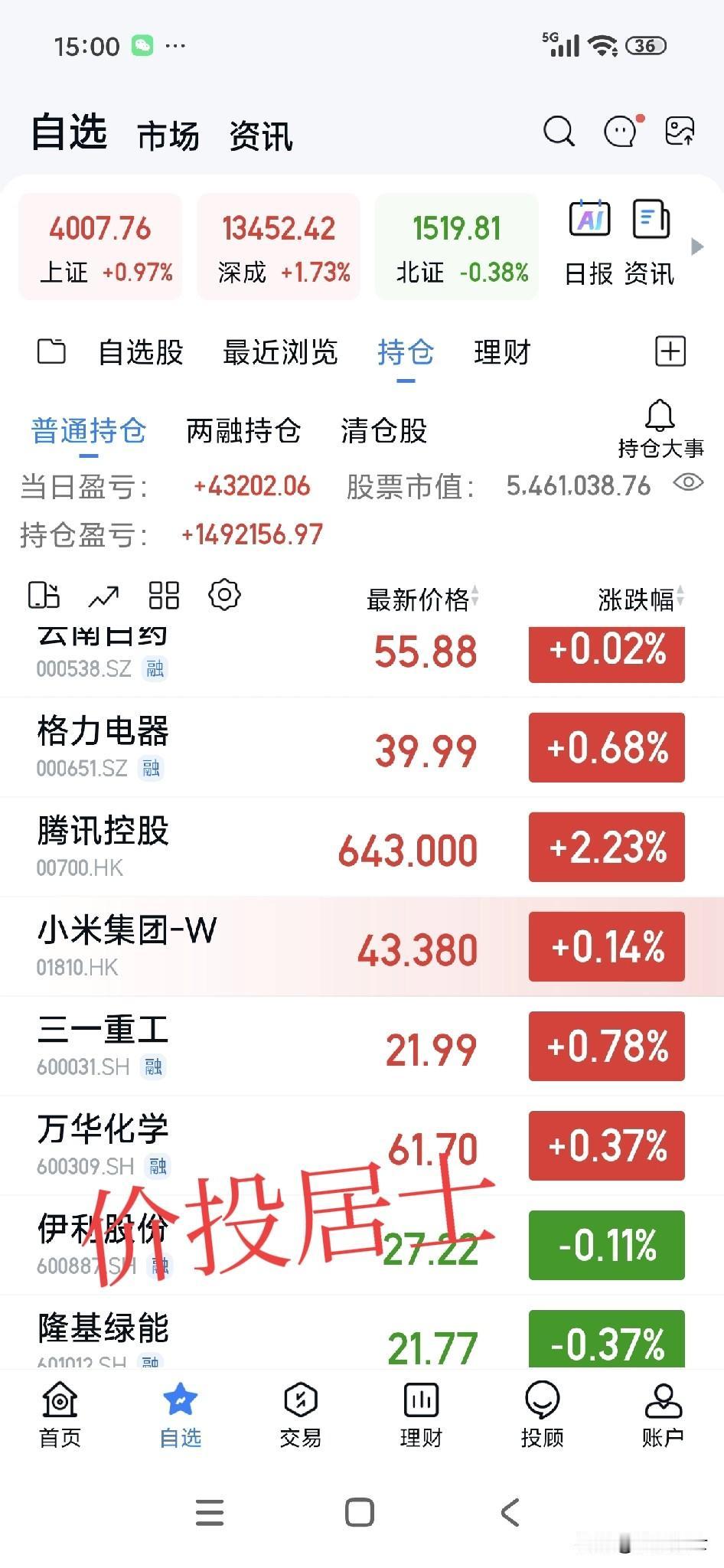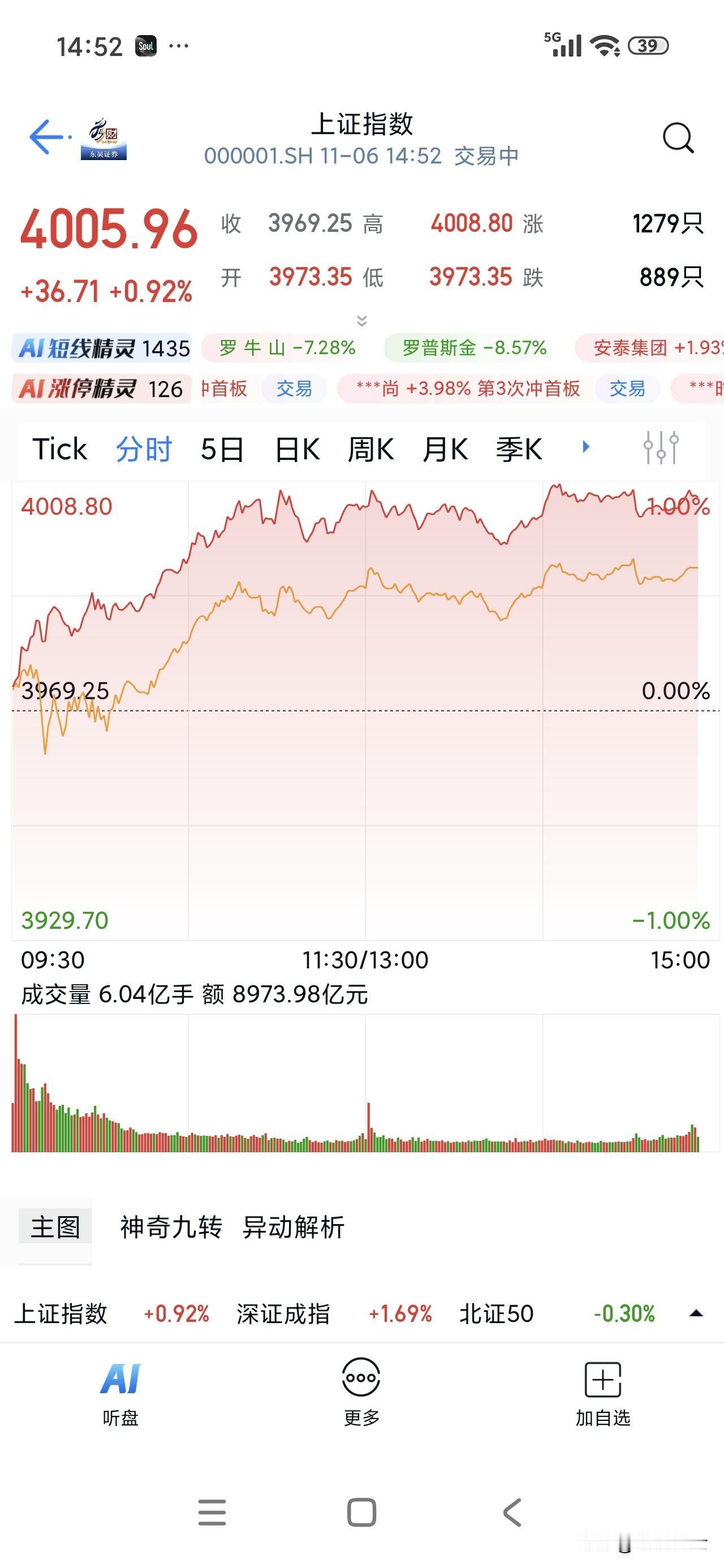 这会A股收盘了!大盘今天再次上攻到4000点了!而我多次表达一个观点,当前的位置没有深跌的基础。上下震荡洗洗盘很正常,毕竟从去年2635.09点开始,大盘也涨了那么多了! 只是说当前的位置暂时上不去也下不来,下面有社保基金和国家队等托底,要说往上突破吧,肯定需要更多的板块参与这次的牛市轮动之中。牛熊的本质就是一轮大的周期!过去熊市我们也一起扛过来了,千万不要再倒在牛市里了!这场牛市还早,我们也不要太着急!还是要有一个慢慢来的心态! 今天大盘最高打到一个4008.8点[笑哭]这个数字还挺吉利的!大的形势来看,中美之间的关税战暂时暂停了,起码关系短期得到缓和了!现在各自的股市也是各自走出自己的独立行情,其实这样就挺好的! 最后还是要恭喜大盘再次站上4000点[呲牙]牛市就是这样,是一种楼梯走势,在震荡中不断向上[赞]