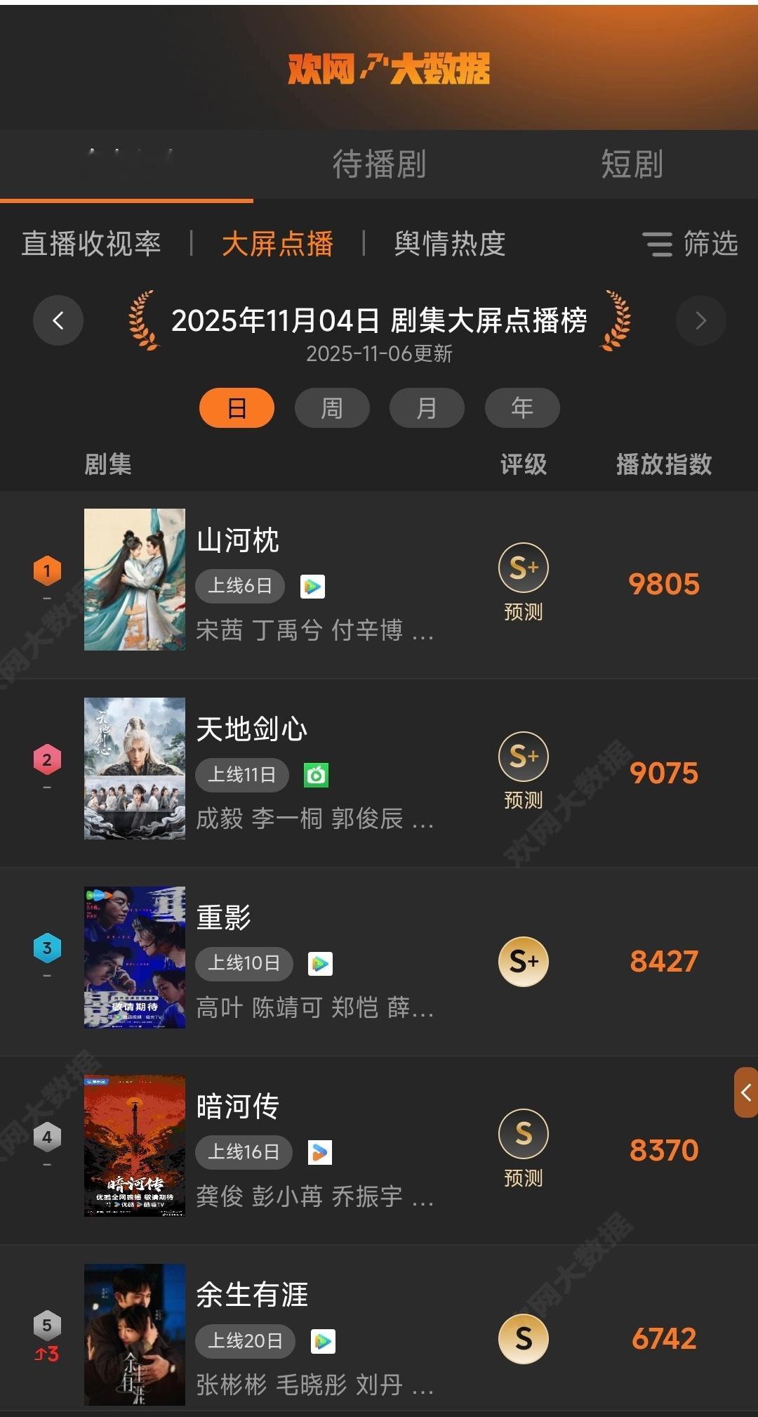 11月6日欢网大数据剧集大屏点播榜山河枕 第一!