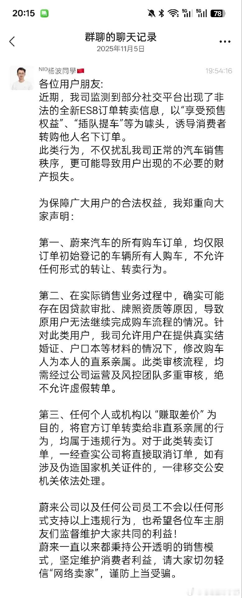 杨波发布声明表示,蔚来汽车的所有购车订单,均仅限订单初始登记的车辆所有人购车,不允许任何形式的转让、转卖行为。