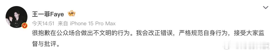 【王一菲回应抽烟乱扔烟头】王一菲致歉11月6日, 王一菲抽烟登上热搜引发热议。随后,回应称,“很抱歉在公众场合做出不文明的行为。我会改正错误,严格规范自身行为,接受大家监督与批评。”