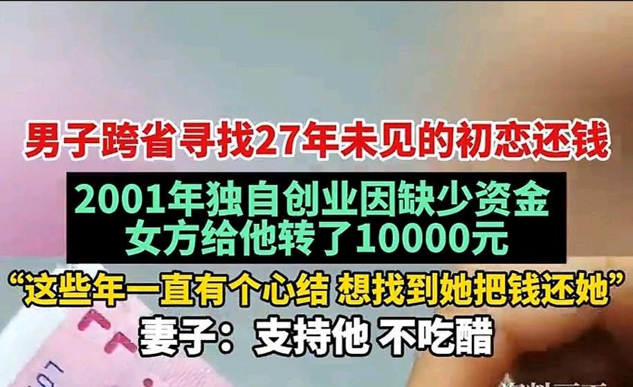 男子跨省寻找27年未见的初恋还钱!男子:“2001年独自创业时,她转账给我10000玩,这些年一直有个心结,想找到她把钱还给她!妻子:支持他,不吃醋!网友:27年前借的一万块,现在大概要还10万才行!其实就是心里还有她,就是想见见她! 这件事让我深感震撼,也让我反思:究竟什么才是真正的“心结”?是那笔钱,还是那段曾经的感情?男子跨省奔波27年,只为还清那份埋藏在心底的情感债务,或许不仅仅是金钱,更是一份未曾释怀的情愫。这种坚持,令人动容,也让我们看到:有些感情,或许早已随时间淡去,但留在心底的那份执念,却始终未曾散去。 网友调侃“还十万才算”,其实说的不过是:心里那份还未了结的情感。我们每个人心中,都藏着一些未完的故事,也许,真正的“还债”,不只是金钱,更是对过去、对那段青春的释怀。这个故事,提醒我们:有些东西,只有勇敢面对,才能真正释怀。