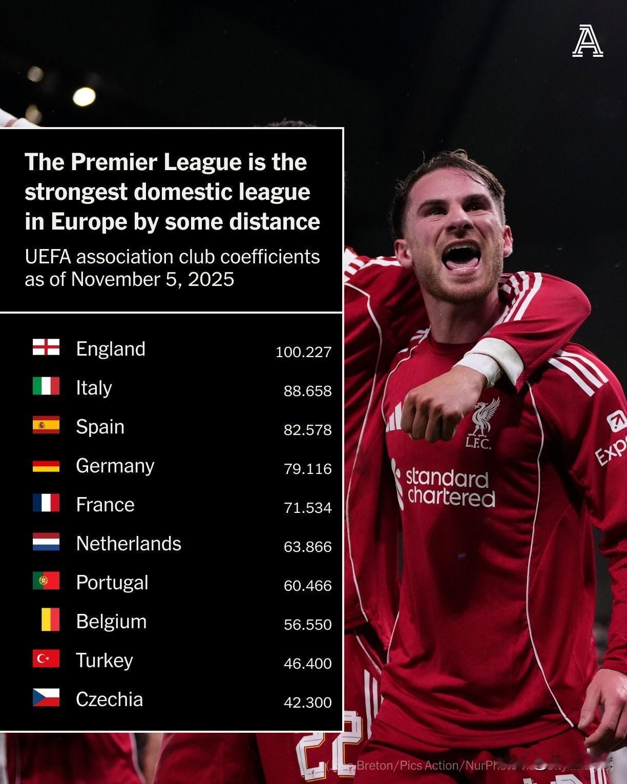 英超是欧洲最强的国内联赛,各国联赛积分排名如下: 1、英超:100.227 2、意甲:88.658 3、西甲:82.578 4、德甲:79.116 5、法甲:71.534 新一波欧冠赛事战罢,英超球队再度交出近乎完美的成绩单。 本周英超球队参与的六场比赛中,"其他联赛对手"遭遇全面溃败:英格兰球队取得五胜一平。 利物浦摆脱赛季初的低迷力克皇家马德里,纽卡斯尔轻取毕尔巴鄂竞技,阿森纳横扫布拉格斯拉维亚,曼城狂胜多特蒙德,热刺大破哥本哈根。唯一的"瑕疵"是切尔西客场2-2战平卡拉巴克。