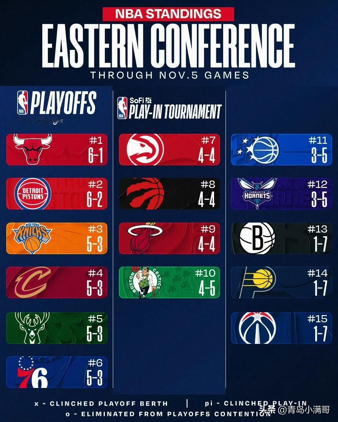 东西部最新战绩排名!!!湖人升至第二,勇士跌至第七,独行侠垫底! 北京时间11月6日,一天的比赛又结束了,几家欢喜几家愁,东西部各支球队排名都发生了变化,一起来看一下吧。 东部方面: 公牛继续领跑东部,活塞升至第二,尼克斯也来到了第三名,东部前三大家有预料到吗? 骑士今天赢球排名第四,雄鹿第五,76人最近下滑来到了第六名,篮网、步行者和奇才这哥三个都是1胜7负垫底。 西部方面: 雷霆虽然赛季首败,但是他们仍然高居第一名;湖人今天赢球升至第二名;火箭最近状态不错排名第三。 掘金第四,马刺下滑到了第五,开拓者下滑至第六,勇士跌至第七,独行侠成了西部倒数第一,这让人意外不? 附加赛区域的几支球队都还在逐渐找状态中,他们都有机会回到上半区,加油! NBA实力榜 西部nba排名 西部常规赛排名 湖人 金州勇士