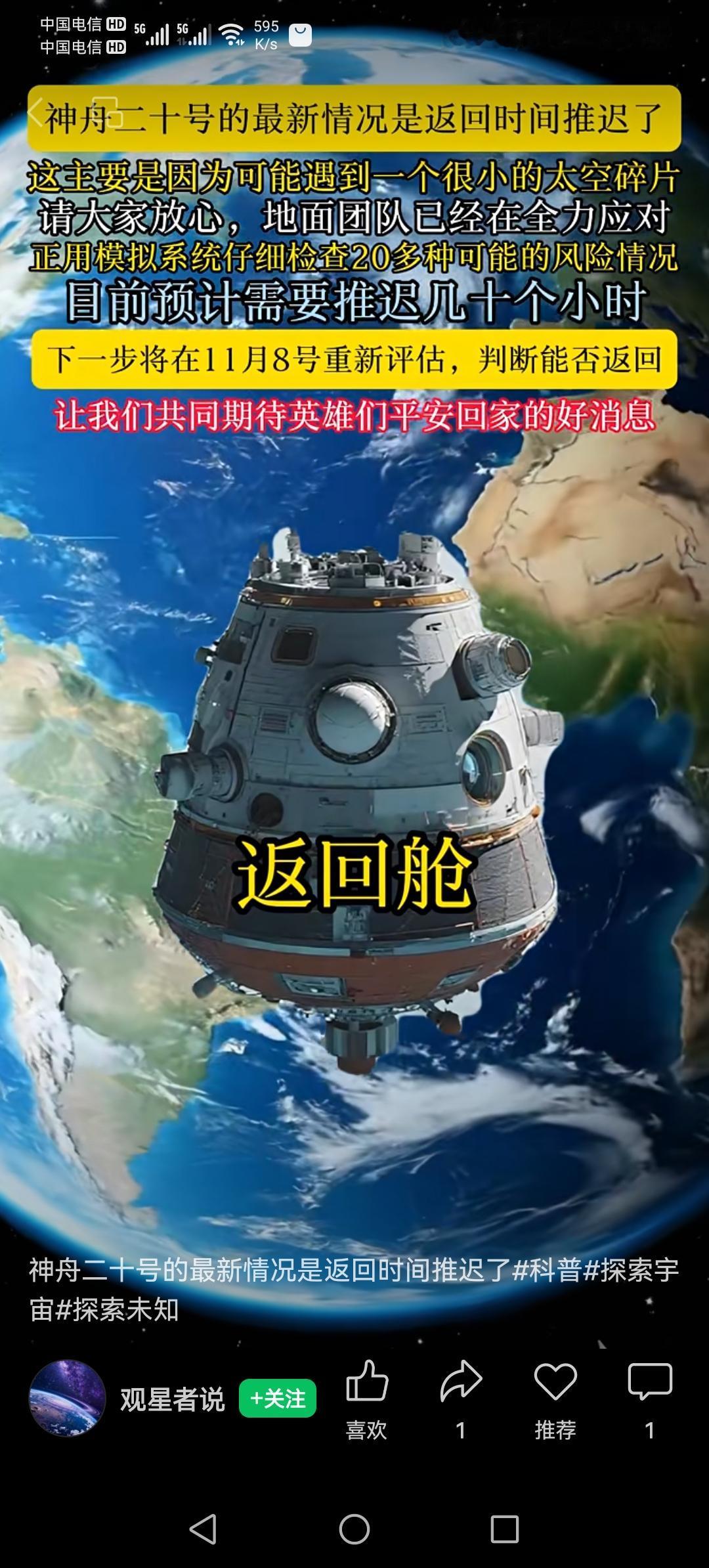 无数国人揪心!神舟二十号疑遭碎片撞击,被迫推迟返航。 “闯祸”的空间碎片到底是什么?危害大吗? 为什么没能提前躲开这次撞击呢?这次返航能很快落实吗?那未来有没有更先进的技术能解决这个问题呢? 下面一一作答: 一、“空间碎片”到底是什么? 空间碎片,也称“太空垃圾”,是指人类在航天活动中遗留的废弃物,包括废旧卫星、火箭残骸、失效的空间器件、工具、零件等。这些碎片在高速运动(每秒几千米)中,具有极强的破坏力。随着航天任务的增加,轨道上的碎片数量也在不断增加,形成了“太空垃圾场”。 二、空间碎片的危害有多大? 空间碎片的危害极大。 威胁航天器和空间站安全:高速碎片可能导致卫星、空间站甚至载人飞船的损坏或毁灭。 增加太空碰撞风险:碎片碰撞会产生更多碎片,形成“碰撞连锁反应”,让轨道环境变得更危险。 影响未来航天任务:碎片密集区域限制了航天器的运行空间,增加任务难度和成本。 三、为什么这次没能提前躲开撞击? 空间碎片的不可预知性是最大难题。 追踪难度大:虽然国际上有碎片监测系统,但由于碎片数量庞大,追踪所有碎片几乎不可能。 突发性强:碎片的轨道变化多端,有时突然出现,难以提前预警。 信息滞后:即使监测到碎片,信息传递和调整航天器轨迹也存在时间差,可能来不及规避。 四、这次返航能很快落实吗? 目前,航天机构会根据碎片监测数据,尽量调整航天器轨迹,避开潜在碰撞区域。 “神舟二十号”推迟返航,说明相关部门对碎片风险进行了评估和应对,采取了措施保障安全。 未来,返航时间的调整会依据碎片监测情况,结合航天器的状态和任务需求灵活安排。 五、未来有没有更先进的技术能解决这个问题? 当然,科技在不断进步,未来有望实现。 更精准的碎片监测与预警系统:利用激光雷达、卫星网络等技术,提高碎片追踪能力。 主动清理技术:如利用机器人、激光碎片减速、捕捉碎片的专用设备,将碎片移除或碎裂成无害物质。 自主避让系统:让航天器具备更智能的自主决策能力,实时调整轨道避开碎片。 国际合作加强:共享碎片数据,联合制定清理计划,共同维护太空环境。 总之,空间碎片是当前太空探索面临的重要挑战,威胁巨大但可控。我们相信,随着科技不断进步和国际合作加强,未来能更有效地管理和清理太空垃圾,为载人航天和全球通信提供更安全的环境。此次“神舟二十号”事件,也提醒我们:保护太空环境,责任在每一个人。 让我们一同期盼,在中国航天完备保障体系的护航下,神舟二十号乘组顺利平安,稳稳踏上回家的路!中国神舟二十号太空碎片