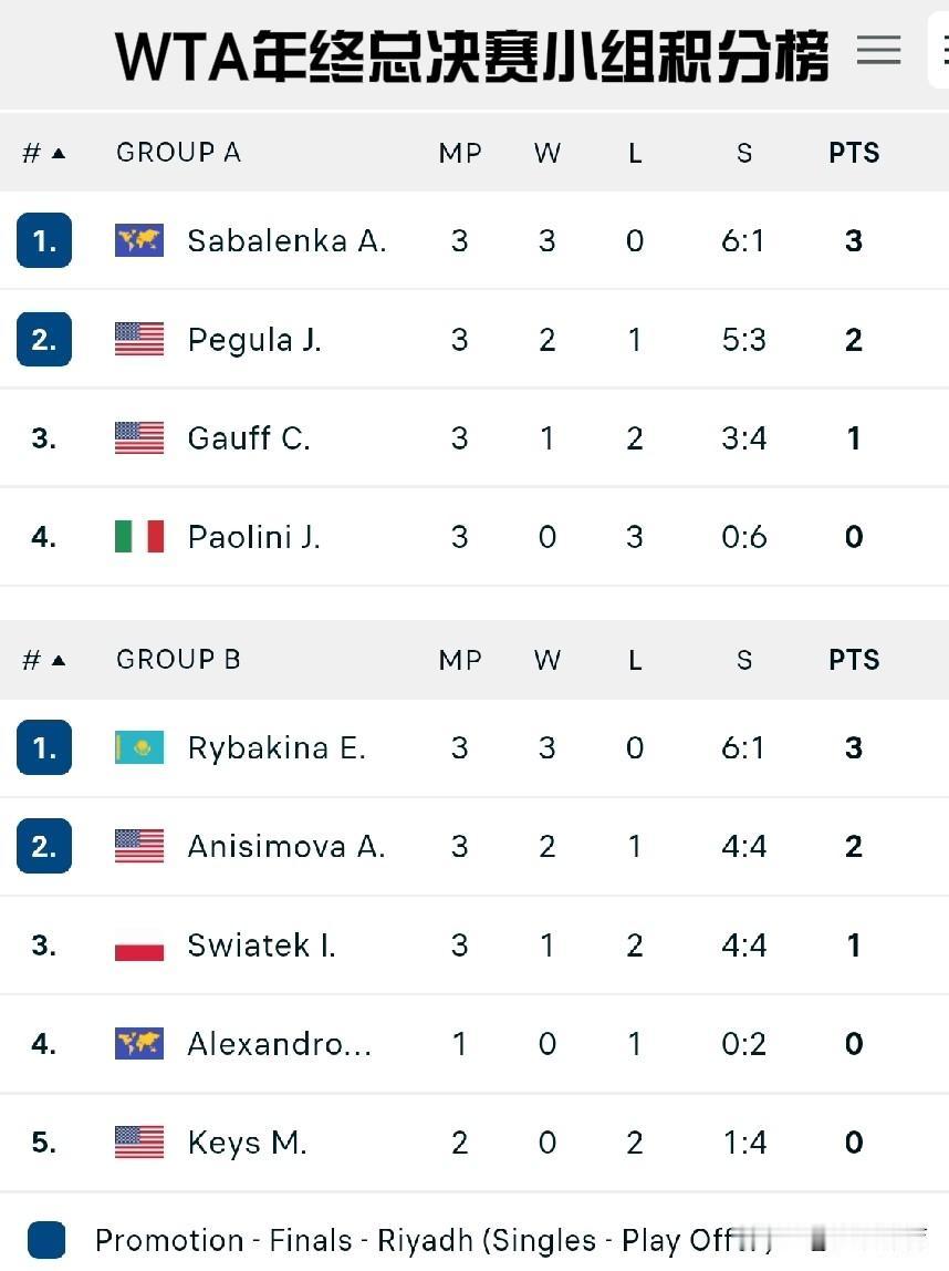 WTA年终总决赛小组积分榜(终极版) 随着佩古拉6-2、6-3战胜保里尼,萨巴伦卡7-6(5)、6-2战胜高芙,两名获胜者进入半决赛 ,与其对阵的分别是另一个小组的莱巴金娜和阿尼西莫娃。 半决赛:萨巴伦卡VS阿尼西莫娃 莱巴金娜VS佩古拉 两场半决赛都是美俄(白俄的萨巴伦卡,以及来自俄罗斯的哈萨克斯坦选手莱巴金娜)。
