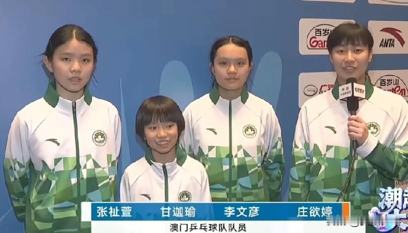 CCTV5《央视报道》全运会乒乓球赛场上的”娃娃兵 澳门队十岁的小将甘迦瑜:我这次参加的是青年组的女子团体赛,我的目标是打好每一分,能拿几分就拿几分。我的偶像是樊振东,因为他很善良,很会克服困难。 张祉萱:我的偶像是马龙,因为他非常特爱打球,他的坚持非常感动我。 李文彦:我的偶像是樊振东,因为他一年前拿了奥运会冠军,我们找他拍照的时候他也会很主动的跟我拍照。 庄欲婷:我的偶像是王曼昱,因为她的坚持,刻苦训练的精神我很喜欢。 2025.11.6