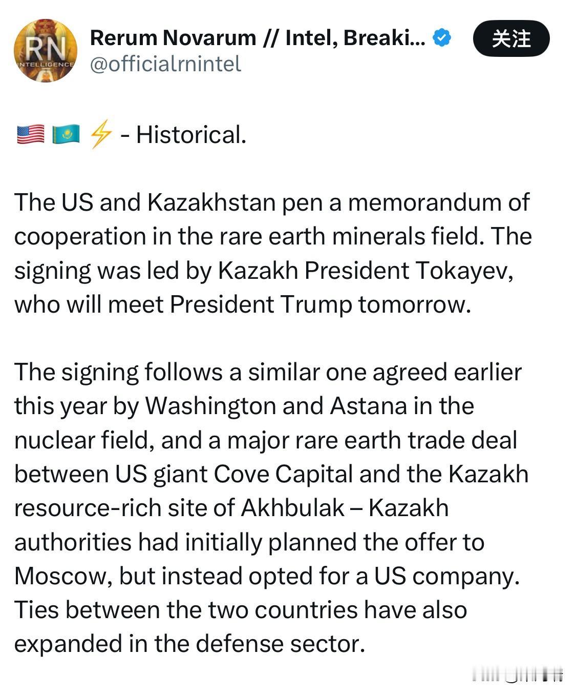 最新消息:哈萨克斯坦和美国签署文件,就关键矿产资源开展合作。 在哈萨克斯坦共和国总统卡西姆-若马尔特·托卡耶夫的见证下,哈萨克斯坦共和国与美国签署了关于在关键矿产领域开展合作的谅解备忘录。 该文件由哈萨克斯坦工业和建设部长叶尔萨因·纳加斯帕耶夫和美国商务部长霍华德·卢特尼克签署。