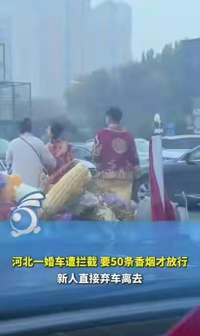 婚车被拦要50条香烟作喜钱新人无奈打车离开:11月5日河北新人婚车被拦要50条