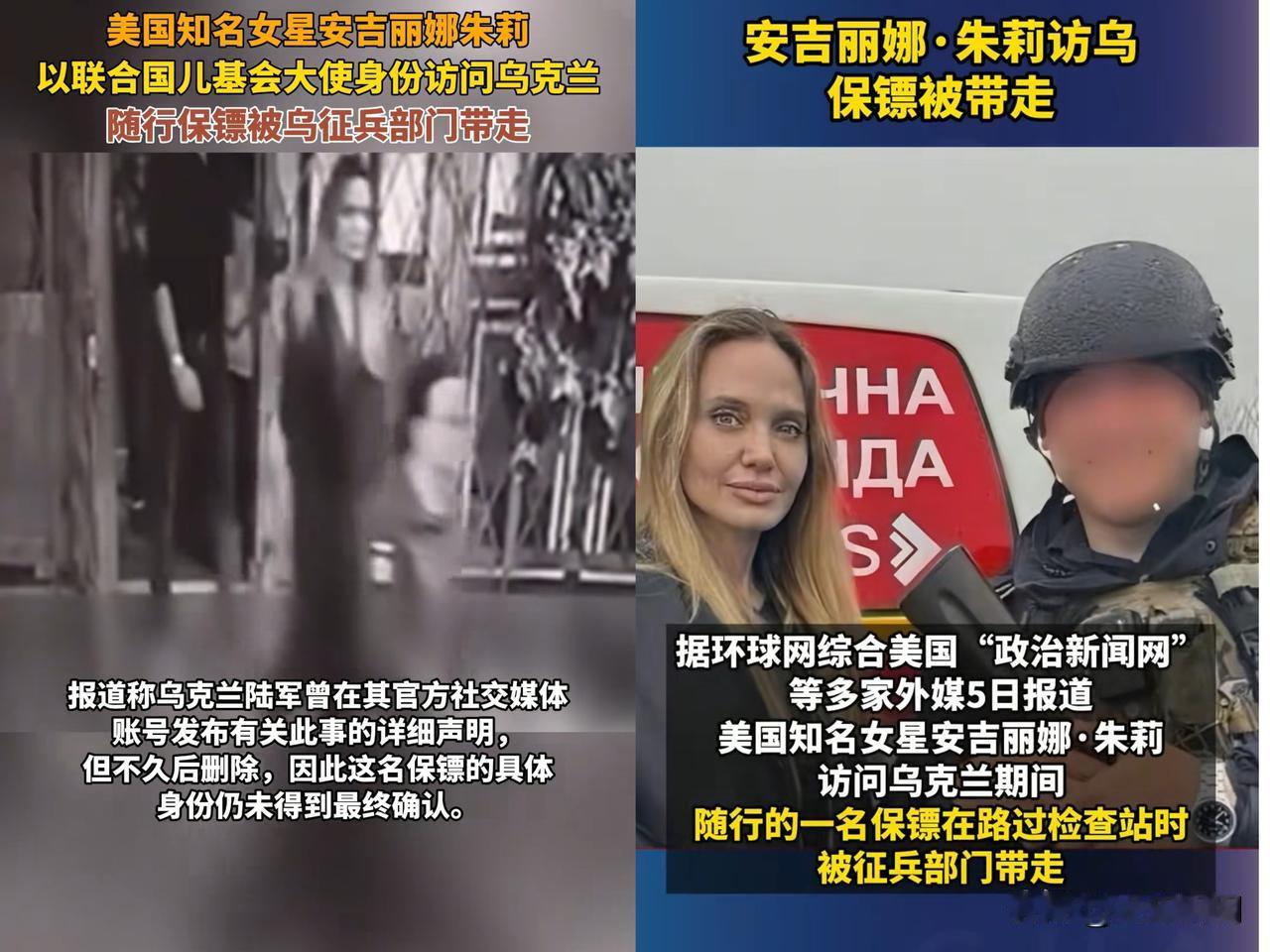 这下全世界都知道了,原来乌克兰真的在到处抓人当兵! 朱莉以联合国儿童基金会大使身份去乌克兰访问,结果发生了件让人惊掉下巴的事儿,她的保镖在访问途中,直接被乌克兰征兵人员给抓走强制入伍了! 连国际明星的保镖都没能躲过,可见乌克兰征兵的压力大到啥程度,都顾不上啥国际影响了。之前那些“强征入伍”的视频,估计十有八九也是真的。 这说明啥呢?战争之下,各方压力都到极限了。但这种抓壮丁的方式,真能解决根本问题吗?大家怎么看乌克兰这波操作?