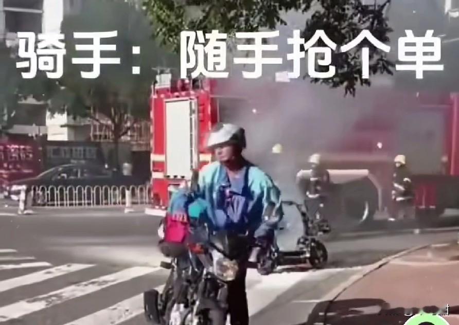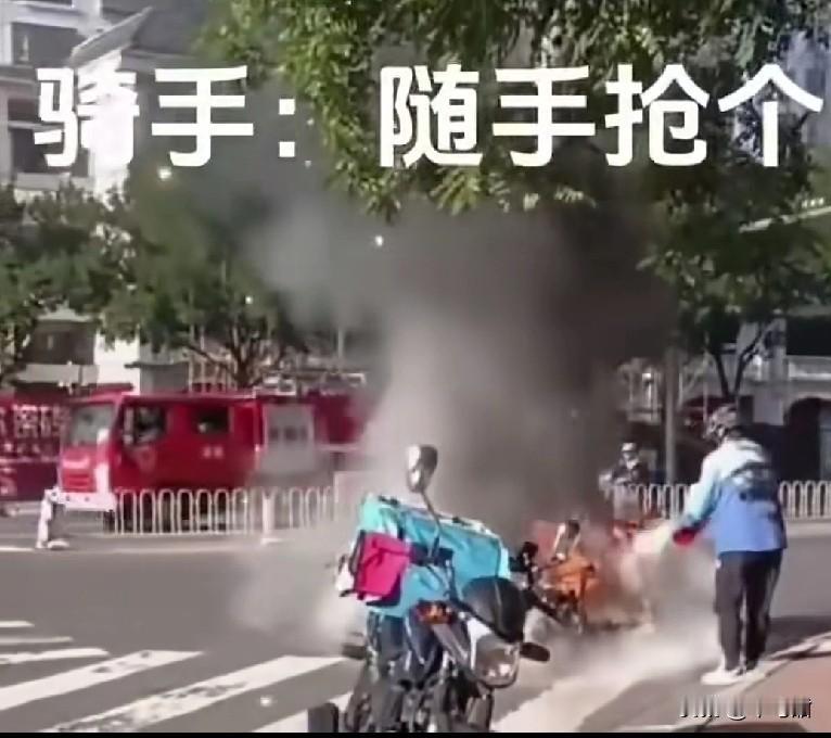 万万没想到,外卖小哥不仅会手机上抢单,现在还能跟消防救援车抢单了。 一骑手路过一街道口,看着燃烧着熊熊烈火的一摩托车,不带半点犹豫,从餐车上拿出一个小型灭火器。 一手丝滑的操作,伴随着背到迎来的二辆消防车的警笛声中,轻而易举的把起火的摩托车灭了,灭了。 等消防车赶到失火的车辆面前,只剩下一缕白色的硝烟。外卖小哥收起了灭火器,又从从容容的放回了餐车里,伴随着下车还懵逼的消防队员,潇洒的扬长而去。 网友都笑疯了:“这绝对是消防车史上最快回队的一次吧!刚到即灭了。外卖小哥的技能也太全能了,抢单、送餐、炒菜,弹琴,翻译,带娃,现在连灭火都样样行。 这波“抢单”抢得太帅了,抢的是时间,护的是平安,必须给这位外卖小哥点个大大的赞!