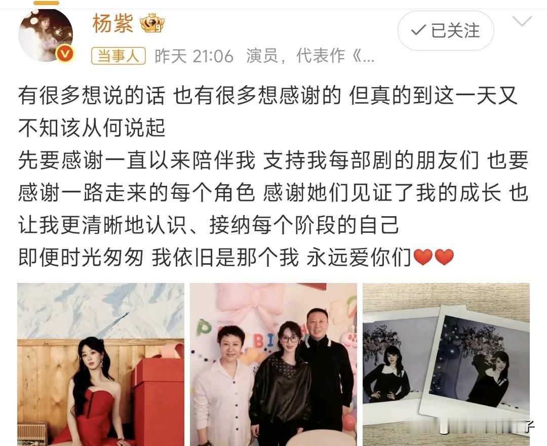 本以为剧组人员陪杨紫庆生,没想到,身旁的二老是父母,这也太幸福了! 11月6日,杨紫迎来33岁生日,晚上,在社交平台发文,主题就是感谢,并晒出一组照片。 其中,一组合照格外抢眼,看文案,还以为剧组(导演)陪着一起庆生,看到评论区网友的留言,才知道,站在杨紫身边的二老是父母,难怪小猴子如此开心。 有一说一,二老可真年轻啊,妈妈一脸的慈祥,爸爸穿着还挺时髦,一家三口同框,满满的幸福感,庆生现场布置好温馨,气球,鲜花,一样都不少。 咱就说,好友牛骏峰卡点送祝福,老同学李现晒照为杨紫庆生,还有父母在身旁陪伴,这个生日过得一定非常开心。 另外,杨紫打扮的真好看,不同的服饰,别有一番感觉。