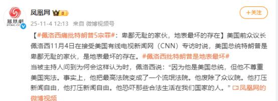 85岁的佩洛西又跳出来了!当地时间11月4日,美国众议院前议长在接受媒体采访时再次毫不掩饰的痛批特朗普5宗罪,并且公开指责特朗普在破坏美国的民主,而且直接怒斥特朗普卑鄙无耻、是地表最坏的存在。 此外,佩洛西面对美国CNN记者时还强调特朗普从不尊重美国宪法,不仅把美国最高法院变成了一个流氓法院、“废除了”美国众议院,而且还打压新闻自由,让每一个生活在美国的人都感到恐慌。   提到宪法之后,佩洛西话头一转,又把火对准了美国最高法院。她直截了当说,特朗普把这个本来该象征司法独立、管着维护公平正义的机构,变成了个“流氓法院”。   懂美国政治的都清楚,最高法院的大法官任命跟总统关系特别近,特朗普当总统的时候,推了好几个保守派大法官进最高法院,佩洛西这通指责,明显是在说特朗普那会儿对司法系统的影响走偏了,让司法这边没了该有的中立劲儿。   更让人在意的是,佩洛西还说特朗普“废了”美国众议院。她以前当过众议院议长,对这个立法分支的核心机构,感情和了解比谁都深。   她嘴里的“废了”肯定不是说机构真没了,而是指特朗普的那些做法——比如绕开众议院推政策、公开质疑众议院的权力之类的——一直在削弱众议院的实权,毁了美国三权分立里立法分支该有的地位,这话直接把当年行政和立法两边剑拔弩张的矛盾点透了。   说完司法和立法,佩洛西又把注意力放新闻自由上。她明确说特朗普一直在打压这个美国号称“基本权利”的领域,从特朗普当总统时好几次公开骂主流媒体是“假新闻媒体”,到限制有些媒体记者去白宫开新闻发布会,再到公开指责骂自己的媒体,这些过去的事都成了佩洛西嘴里“打压新闻自由”的硬证据。   她觉得这些做法一直在压缩新闻媒体的生存空间,让本来该盯着权力、监督权力的媒体没法干该干的事。   佩洛西觉得,这所有事最后都指向一个结果:让每个住在美国的人都觉得慌。她在采访里没回避这种老百姓的情绪,反而直接说出来,特朗普这些行为不光在政坛里搅得不安生,还实实在在渗到了普通人的生活里。   从对国家制度不放心,到对以后的日子没底,越来越多美国人被这种不安裹着,佩洛西把政治上的事和老百姓的感受直接绑一块儿说,也让她的指责更容易戳中普通人心里的焦虑,让人更有共鸣。   佩洛西是美国政坛的老人了,好几任总统的任期她都经历过,她怼特朗普肯定不是一时脑子热。   在特朗普当总统的时候,俩人就因为预算案吵过,还因为弹劾的事正面刚过,佩洛西甚至牵头搞过弹劾特朗普的程序,俩人的矛盾就没真正停过。   这次11月4日的采访,更像是把攒了好久的不满一股脑倒出来,而且跟以前比,这次说的话更直接、态度更硬,一点没打算妥协。   当地时间11月4日这个时间点也挺关键,离美国下次总统大选越来越近,政坛里各方说话都开始带上更明显的政治倾向。   佩洛西这时候站出来骂特朗普,除了说自己的立场,可能也跟美国现在内部的政治氛围有关——随着特朗普再参选的可能性越来越大,反对他的声音也开始更早、更集中地冒出来。   佩洛西这次采访,某种程度上也代表了美国民主党里一部分人的态度,是对着支持特朗普的阵营公开叫板。   现在还没看见特朗普对这通指责有直接回应,但按他以前的行事风格,大概率会通过社交媒体或者公开场合反驳。   从过去俩人对着干的情况看,特朗普从来不会在这种批评面前不吭声,他要么会否认佩洛西说的事,要么会反过来骂佩洛西是“为了政治目的找茬”。   佩洛西这次一点不留情的痛骂,很可能会让俩人又开始新一轮隔空吵架,让本来就紧张的美国政坛氛围再添点火药味。   佩洛西说的“五宗罪”虽然没一条一条说具体是啥,但结合以前公开的信息不难猜,这些事很可能包括特朗普当总统时的移民政策争议、对国会山骚乱事件的态度、卸任后扯出的商业法律麻烦,还有疫情期间政策搞砸的事等等。   佩洛西没详细说每一条,但用“五宗罪”这个说法,明显是想强调特朗普惹争议的事不是单一件,而是好几件严重的事堆一块儿,这么说也是为了让自己的指责更有力度。   美国各大媒体对这次采访的报道也明显不一样。CNN是佩洛西专门去受访的媒体,不光把她每句话都详细登了出来,还加了一堆背景分析,甚至请评论员聊这些话会有啥影响;而偏向保守派的媒体,比如福克斯新闻,就比较低调,有的只是简单提了下这事,有的直接附上了质疑佩洛西的话,说她是在“挑动分裂”。   这种媒体报道的差别,也能看出来美国媒体行业本身就有政治倾向,进一步显露出美国社会在政治问题上有多分裂。
