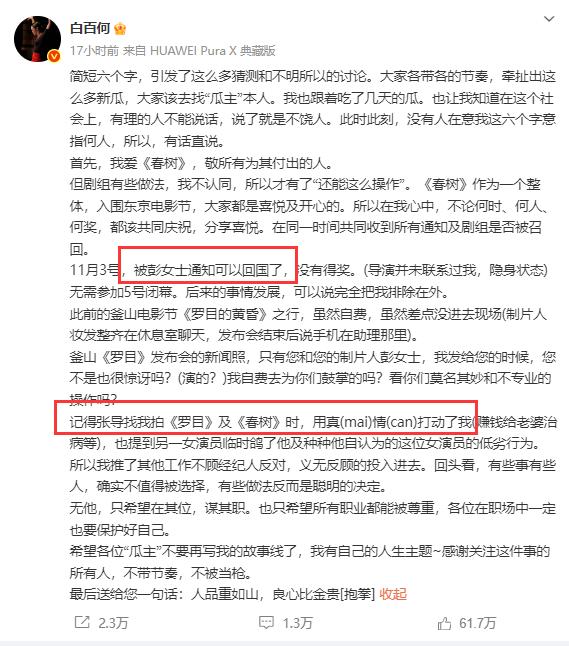 从白百何的回应来看, 她从头到尾针对的就只有2个人, 与得不得奖真的没有关系,所以王传君只是无辜受牵连!第一个人就是彭女士,那就是这部影片的制片人!作为《春树》的女主角,她却没有被尊重,甚至没有得到应有的公平待遇,没得奖就被通知提前离开,甚至都不让她和整个剧组一起开庆功宴,明明她也是有功之人啊! 第二个人就是这部剧的导演,当初邀请她去拍戏的时候,装可怜博同情,以至于白百何推了其他的工作,一心一意留在剧组拍戏,电影成功了,她却成了局外人,这才是她气愤的点,既然不让吃饭,那大家就都别吃了,敢做掀桌子的人,不得不说这姐也是很勇的人了! 她从头到尾争的都不是拿不拿奖的问题,而是自己在这部剧成功之后,她就完完全全成为了局外人,好像整部剧的成功都跟她没多大关系了一样,让她付出的心血和努力都白费了,知道娱乐圈的水很深,没想到这些年都开始藏不住,慢慢露出来了!