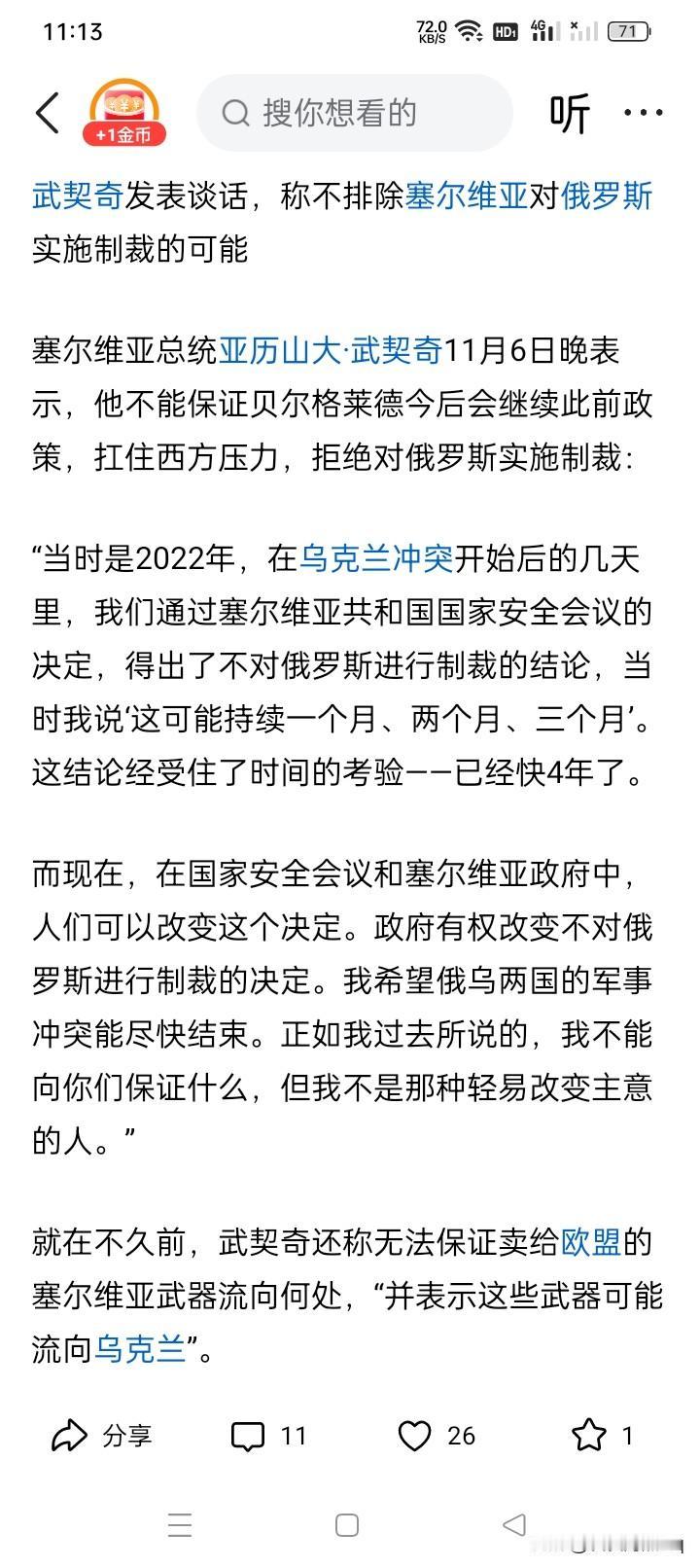 武契奇大概扛不住了! 塞尔维亚总统武契奇表示,有可能改变自从俄罗斯对乌克兰的战争