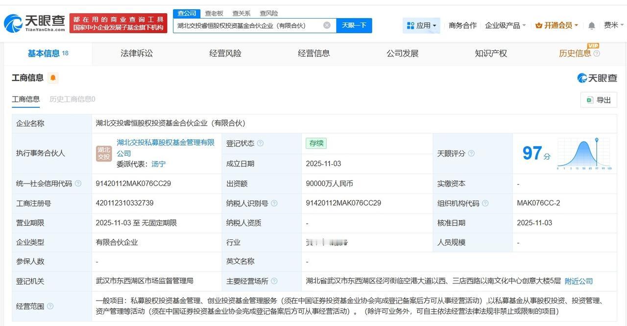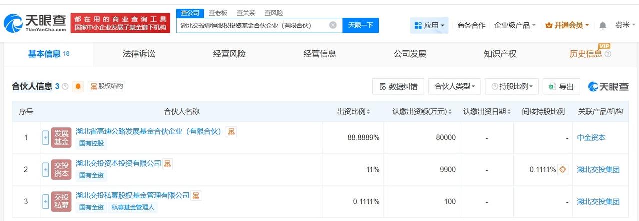 湖北交投睿恒股权投资基金登记成立出资额9亿 天眼查工商信息显示,近日,湖北交投睿恒股权投资基金合伙企业(有限合伙)成立,执行事务合伙人为湖北交投私募股权基金管理有限公司,出资额9亿人民币,经营范围为私募股权投资基金管理、创业投资基金管理服务,以私募基金从事股权投资、投资管理、资产管理等活动。合伙人信息显示,该基金由湖北省高速公路发展基金合伙企业(有限合伙)、湖北交投资本投资有限公司、湖北交投私募股权基金管理有限公司共同出资。 天眼查信息: