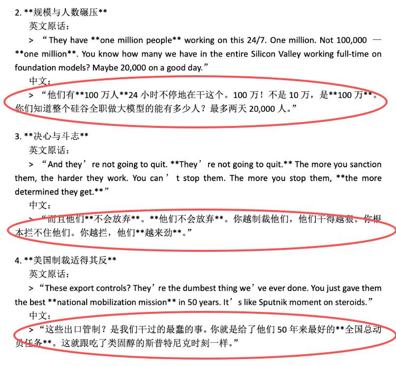 疑黄仁勋的私人谈话流出,果然是一眼到底的洞见者。不服高人有罪。 顶级企业家的牛逼之处,在于用最简单的数据,告诉你未来的结果。 当然,这也是老索每天晚上直播核心理念。贯彻始终 黄总是这么说的。目前文件的真假不好判断,但从逻辑的严谨性来说,高手 他说中国AI五年会超地美国AI。为什么呢? 一,中国有100万人24小时不停地在干大模型。1不是10万,是100万 而整个硅谷全职做大模型的能有多少人,最多两天20,000人。也就是一天1万人 试问,有什么技术,一百万人24小时不停的攻打,打不下来的? 二,中国人不会放弃。你越制裁他们,他们干得越狠。你根本拦不住他们。你越拦,他们越来劲 为什么黄仁勋能想到,而美国政客想不到,因为他自己就是中国人。他太清楚,中国人骨子里的那股劲是什么了。从小我们的教育,就是吃得苦中苦,方为人上人。一个苦中苦,一个人上人,美国 科技界都懵逼了,他们目标是美好的生活,我们不是,中国科技界的目标是人上人。 三,这些出口管制?是我们干过的最蠢的事。你就是给了中国50年来最好的全国总动任务。这就跟吃了类固醇的斯普特尼克时刻一样。这是什么意思呢,1957年10月4日苏联成功发射世界首颗人造卫星“斯普特尼克1号”,引发美国在太空竞赛中的危机意识。 任凭黄仁勋喊破喉咙,美国政客好像就是听不见,其实,也不是听不见,而是他们根本不懂中国的文化 。哈。。。黄总五年超过美国,我认为乐观了,但不用超过。就算是将来平分AI的天下,也是不得了事,股市炒什么?还用瞎猜吗? (关注老索)