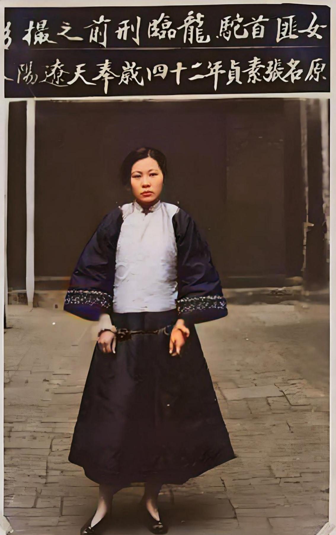 照片中的女人叫张素贞(绰号“驼龙”)是民国时期东北著名女性绿林人物,活跃于20世纪20年代,后被官府捕获处决。这张照片就是临刑前拍摄,当时24岁。 张素贞1901年出生于奉天辽阳(今辽宁辽阳),家境贫寒。1919年因生活所迫流落至长春,被拐卖至妓院,艺名“翠喜儿”。 ​ 1923年结识绿林首领王福棠(“大龙”),后与之结合并加入其绺子(土匪武装),得外号“驼龙”。 ​ 1924年王福棠在一次行动中被击毙,张素贞成为绺子首领,率部活动于吉林、辽宁交界地区,以劫掠富商、对抗官军闻名。 ​ 1925年其部众在吉林德惠被官军击溃,张素贞逃脱后辗转潜藏。同年11月在长春妓院被警方识破身份并逮捕。1925年11月14日被判处死刑,在长春当众处决,时年24岁。