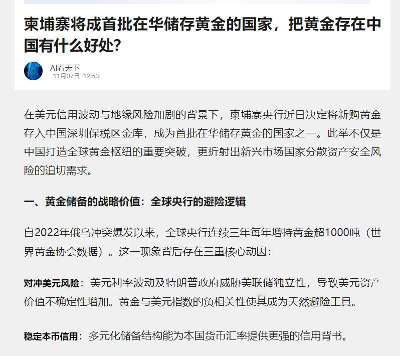 柬埔寨首相洪玛奈做出了明智的选择。 据报道,柬埔寨将成为首批在中国储存黄金的国家之一。 柬泰冲突后,柬埔寨积极向美国靠拢,更是提名特朗普为诺贝尔和平奖候选人,但是柬泰冲突并没有真正解决,柬泰边境的排雷工作也停了。 现在柬埔寨选择将其部分储备存放在位于深圳保税区的金库中,明智之举。 表面看是黄金换个仓库,里子全是现实利益算计。 咱们不妨掰扯掰扯,看看这波操作背后藏着多少门道。 先说柬泰冲突这出戏。 洪玛奈政府去年把特朗普搬出来当救世主,提名这位“懂王”拿诺贝尔和平奖,结果呢?边境排雷工作停得比火箭还快,泰国那边该埋的地雷一寸没少。 美国嘴上喊着“民主自由”,实际给柬埔寨的援助比撒胡椒面还零散。 最绝的是今年十月份,柬泰签了个联合声明,条款写得比超市小票还长,什么“三个月内清雷”“六个月撤重武器”,转头泰国军方该干嘛干嘛。 这操作跟网购时卖家发“亲,五星好评返现哦”一个套路——光说不练假把式。 这时候中国深圳保税区金库闪亮登场。 别看这地方名字带“保税”,实际是黄金界的“保险柜PLUS”。 柬埔寨把新买的黄金往这儿一存,相当于给自家钱袋子上三把锁:物理安全上,金库安保堪比诺克斯堡,防爆结构能抗八级地震;交易效率上,以前东盟国家存黄金得绕道伦敦,耗时两周交五成手续费,现在通过香港仓库三天到手,成本砍到1.2%;最狠的是数字人民币加持,泰国商人卖榴莲给中国,十秒到账零手续费,比SWIFT系统快得跟外卖小哥送餐似的。 这里头藏着个细思极恐的真相:美国冻结他国资产的骚操作,已经让小国们吓得灵魂出窍。 2022年俄罗斯3000亿美元外汇说没就没,2024年柬埔寨太子集团150亿比特币被美国没收,连电诈赃款都敢动。 这种情况下,柬埔寨把黄金存在中国,相当于给自家财宝买了份“防诈骗保险”。 更绝的是,深圳金库隶属上海黄金交易所,这个平台去年成交量6.8万吨黄金,顶得上全球央行两年购金量。 柬埔寨存点黄金进去,等于蹭上了人民币国际化的快车——现在东南亚国家用黄金换人民币买中国货,跟玩俄罗斯套娃似的,里外都占便宜。 再看看地缘政治这盘大棋。 柬泰冲突说到底是小国夹在大国间的生存游戏。 柬埔寨以前学美国搞“大国平衡术”,结果发现这平衡木晃得人头晕。 美国给的安全感就像网购的“七天无理由退货”——说好的军事援助,转头就变成对台军售的借口。 反观中国,中柬贸易额从2013年的40亿美元飙到2024年的178亿,中国投资的西港经济特区养活了柬埔寨10%就业人口。 这种实打实的利益捆绑,可比白宫那些空头支票靠谱多了。 这里头还有个耐人寻味的细节:柬埔寨存的是“增量黄金”,老底子还在瑞士捂着。 这操作像极了年轻人理财——工资卡放余额宝,年终奖存银行理财。 既享受中国市场的红利,又留着瑞士的“传家宝”。 反观美国那边,纽约金库里堆着926吨黄金,但特朗普政府动不动就拿关税当武器,搞得各国央行天天提心吊胆。 最逗的是摩根大通这类投行,现在玩起了黄金再抵押,15%的回报率比毒品还诱人,可见资本市场的疯狂。 说到底,柬埔寨这波操作是给全球小国上了一课:在美元霸权摇摇欲坠的年代,黄金才是真正的“硬通货”。 中国打造的“黄金+人民币”体系,就像给国际贸易开了条新航道——东南亚国家用黄金质押换人民币买中国货,完全绕开美元结算。 要是这模式普及开来,每年能省下1200亿美元给美元当“过路费”。 更狠的是,上海黄金交易所搞的“数字人民币+黄金”组合,让跨境结算快过微信转账,连特朗普的关税大棒都追不上。 不过别以为这事就这么简单。 纽约金库里现在堆着926吨黄金,比2023年多了75%,全拜美国大选闹剧所赐。 伦敦市场更逗,金条短缺到提取要等半个月,跟春运抢票似的。 这说明资本市场的嗅觉比政客还灵光——哪里稳定往哪跑。 柬埔寨这54吨黄金虽然只占全球储备的0.3%,但就像往平静湖面扔了块石头,涟漪够西方喝一壶的。 最后说句大实话:当泰国用黄金换人民币买高铁,当马来西亚用质押黄金付石油款,当沙特考虑用黄金挂钩人民币结算石油,这场静悄悄的黄金革命,可比航母战斗群吓人多了。 毕竟在这个连美国盟友都开始囤黄金的年代,谁能提供更靠谱的金融基础设施,谁就能掌握21世纪的话语权。 柬埔寨这步棋下对了,但棋盘上的较量,才刚刚开始。