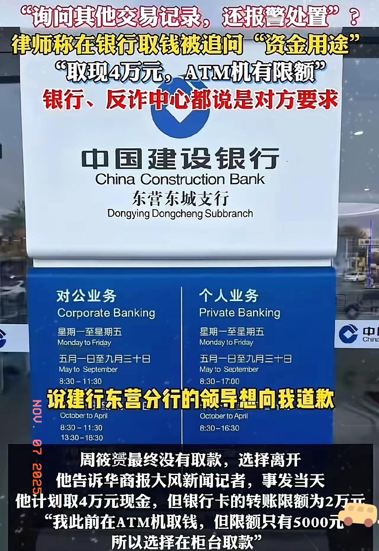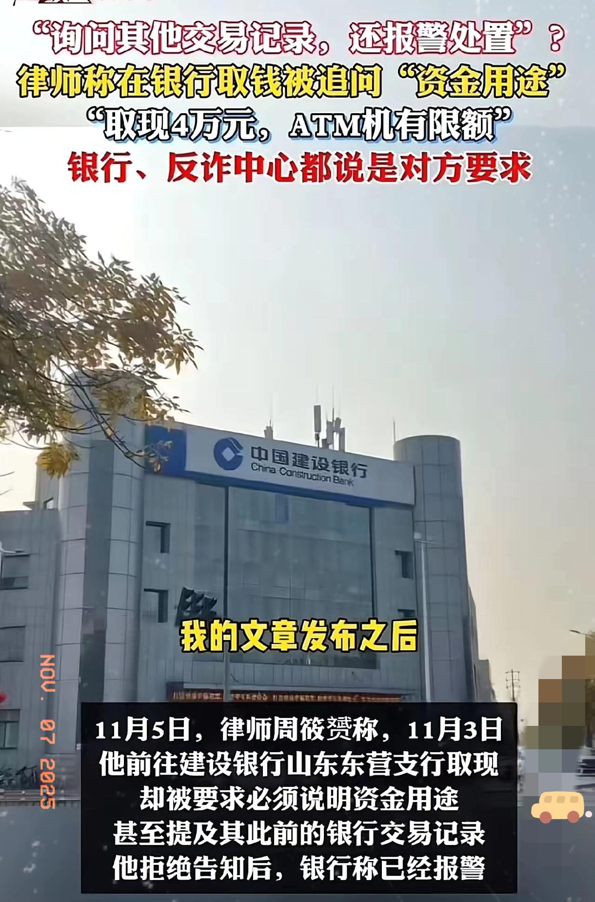 “银行这次碰到硬茬了!”山东东营,律师去银行取4万现金,被追问“资金用途”,律师认为这侵犯自己的隐私权,拒绝告知,银行竟然报案处置! 反诈的初衷是保护老百姓财产,可层层加码到盘问取款用途、逼公民自证清白,就彻底跑偏了。储户的钱存进银行,合法取现本是基本权利,凭啥要像犯人一样被审问? 骗子想找借口轻而易举,真正被为难的,全是守规矩的普通人。银行作为服务行业,把“反诈”当成变相限制公民权利的挡箭牌,既违背法律法理,也寒了储户的心。 律师不接受简单道歉太对了,这不是个人恩怨,而是要堵住这种“一刀切”的违规操作。反诈该对准骗子,而不是给合法权益添堵。你取现金时遇到过类似的“过度盘问”吗? 银行取款风波 反诈不能层层加码