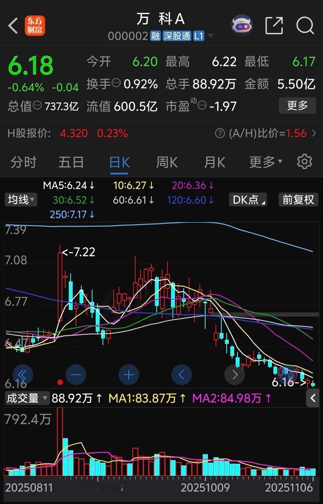 万科A反弹无力再次下跌0 .64%,收盘价再创10年新低,昨天跳水创新低后抄底资金涌入拉升企稳,但是今天更弱开盘直接低开低走,主力资金净流出超过一个亿,从大盘来看今天站上4000点重要关口,72家股票涨停,行情仍然火爆,但是万科感觉开始被抛弃了,股民一片悲观,分时走势毫无波澜,资金主动流出,去年最低价已经没有支撑,市净率跌到0.42,股民普遍感到非常迷茫。